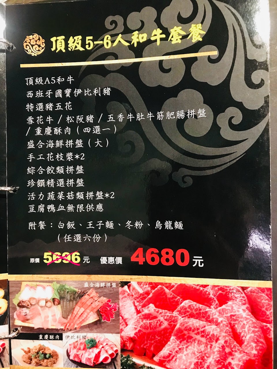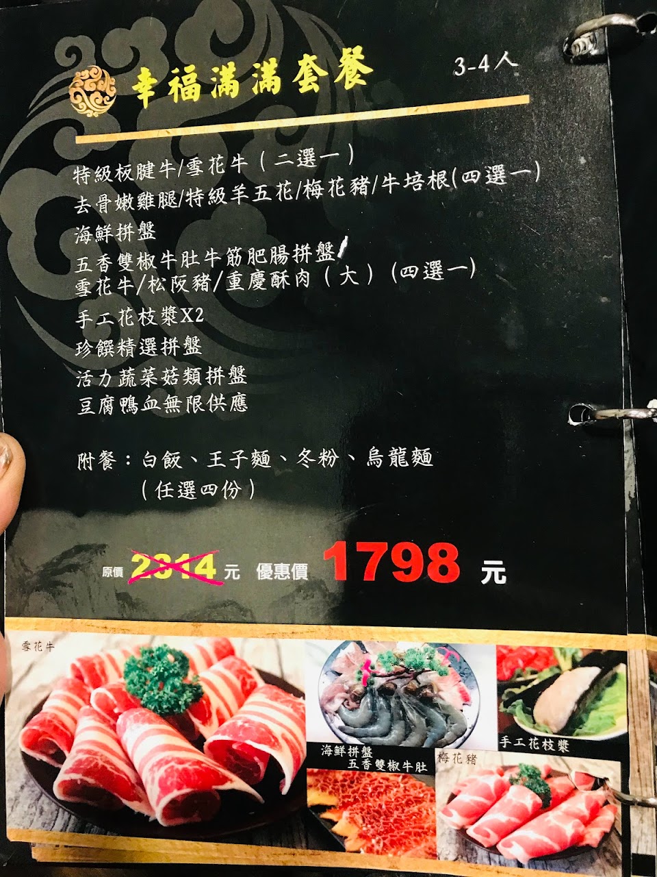 昨天和同學約在這裏吃火鍋))我們點的是$1880套餐)加一成服務費~湯頭屬於鴛鴦鍋、湯都蒜頭人蔘牛奶、另一種辣度可以選擇、我選的是中度麻辣燙湯、湯裡面的鴨血和臭豆腐可以無限加點)))服物人員會依人數先給2個沾醬、之后上菜速度也很快、牛小排肉片、魚、魚槳、豬肉片、豬肉丸一盤、疏菜盤、酸梅汁也很解膩))我不喜歡套餐的丸子~吃起來味道很怪!也不像貢丸~其它附料都不錯~服務人員也很主動會問妳要加麻辣湯?吃到一半我就飽了))小夥伴們有空可以去吃看看~
