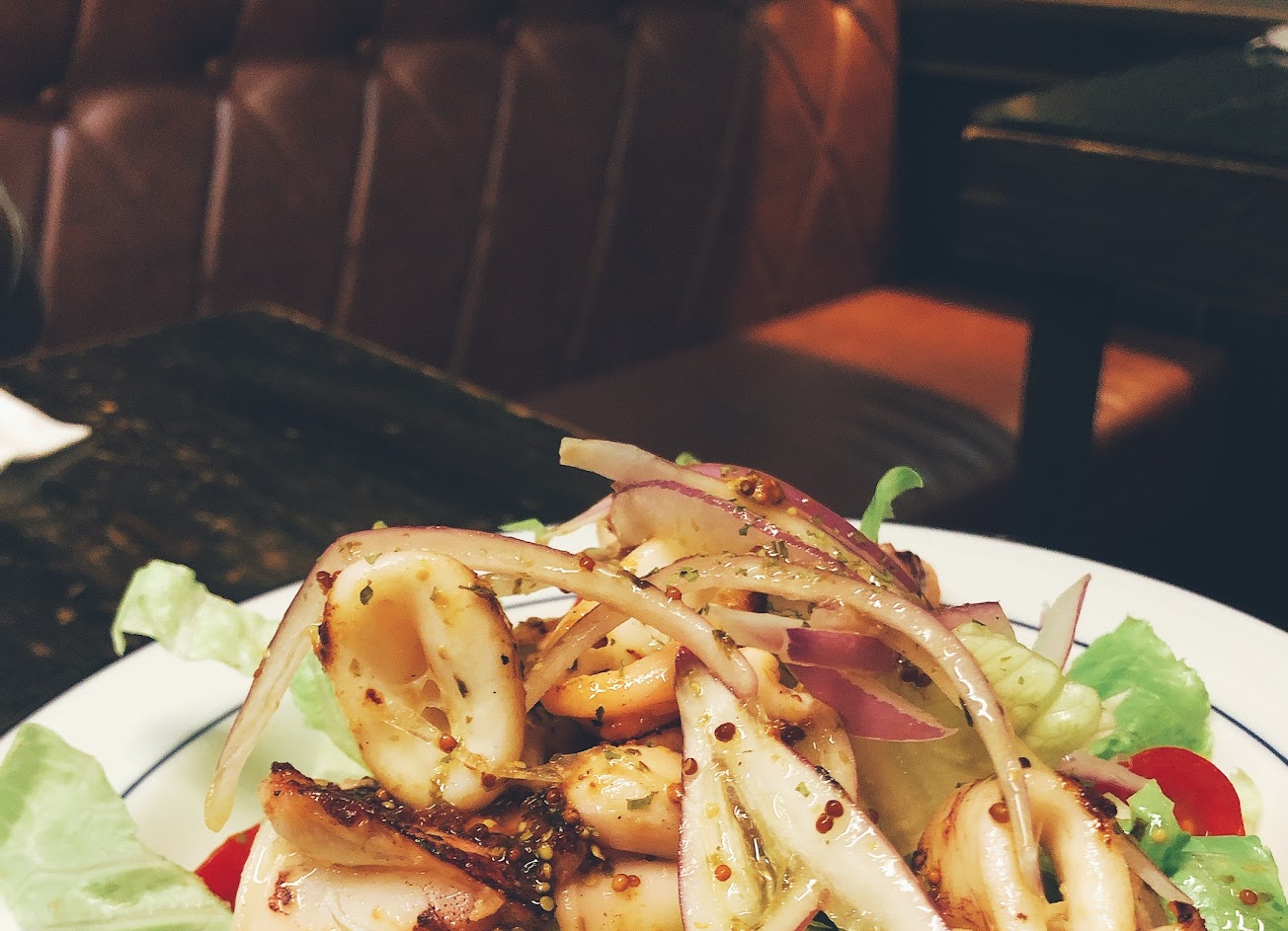 今天點了海鮮披薩,炸花枝,炸魚,墨西哥薄餅,小管沙拉等,味道不錯,披薩上的海鮮吃起來感覺很新鮮,特別是蝦没有像披薩專賣店的那樣吃起來像吃橡皮的蝦那樣。唯披薩上的起司有點水水的,跟餅皮是分離的,我們吃起來不太習慣,但味道還是不錯。炸魚是英式的fish & chip味道也很好,但有魚刺,對於不會吃魚吐刺的老婆就很辛苦,建議店家可以選沒有刺的魚來處理,以免有意外發生。
