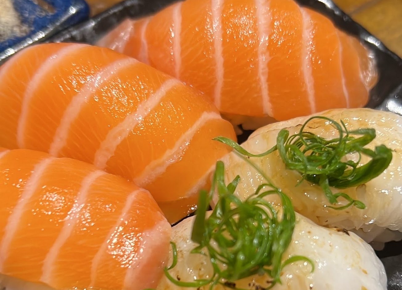 推粉紅烏龍麵,奶香味厚,兩人同行分著吃較剛好不會膩。若是炙燒鮭魚握壽司(口感偏軟無炙燒香氣)、金沙松阪豬(吃起來更像偏乾硬的重鹹金沙炸花枝)、豚五花大蔥串(無肉香且蔥的纖維粗),可以有更好的選擇。