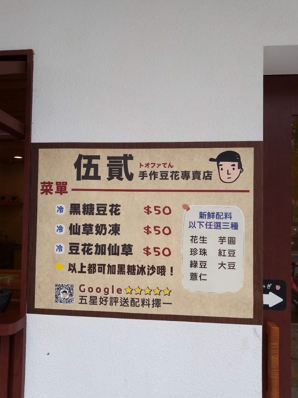 我愛伍貳,豆花綿密好吃,還有搭上豐富的料,店員親切和藹可親,配上冰沙消暑絕配