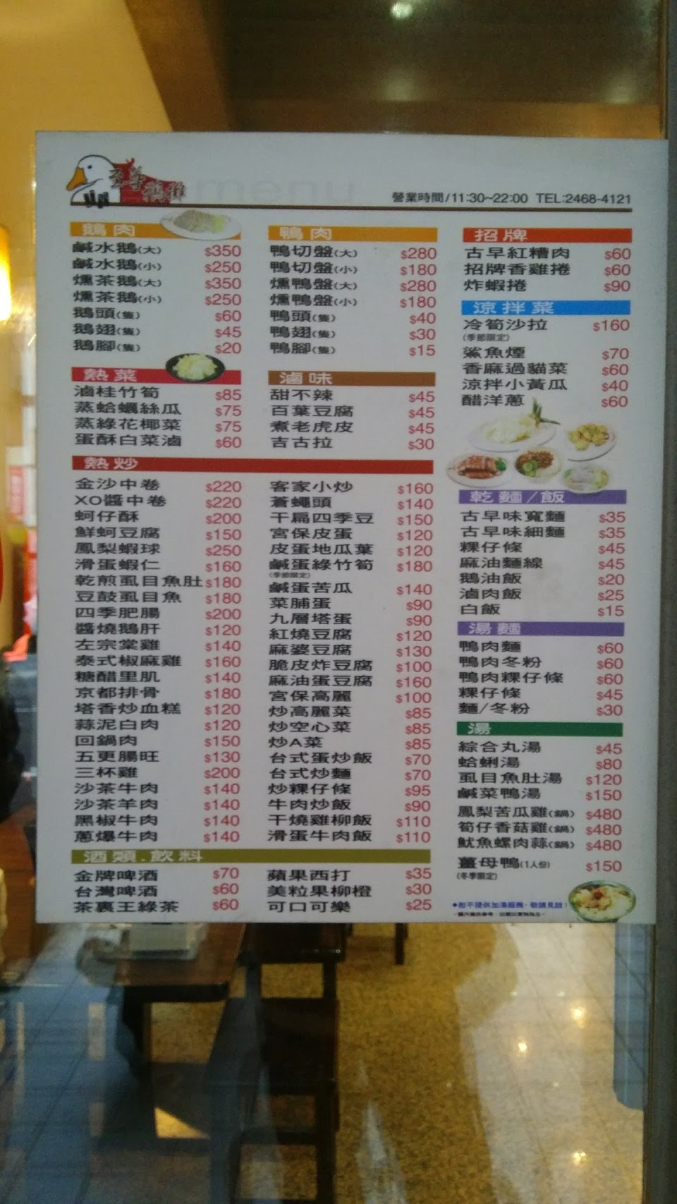 這裡的主要賣鴨肉跟鵝肉,種類還不少,加上熱超類的食物,相當多樣話。店的一樓空間不算大,二樓還有大圓桌可供多人用餐。廚房屬於半開放式,算得上乾淨,用餐環境也很乾淨。餐點價位中等,不算貴,且口味也不錯,值得推薦!