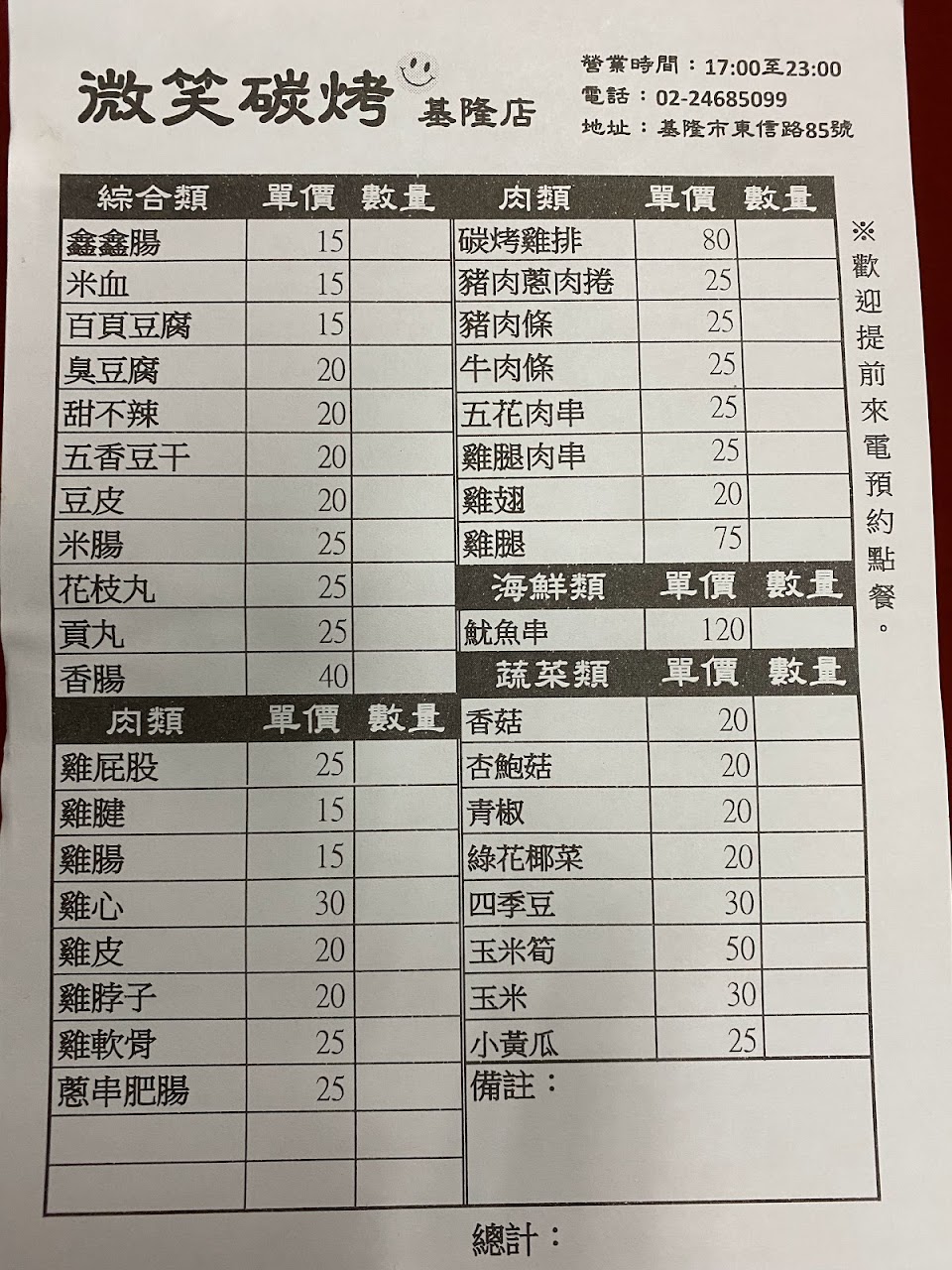 2024最新在地推薦餐廳的菜單_微笑碳烤的菜單、圖片