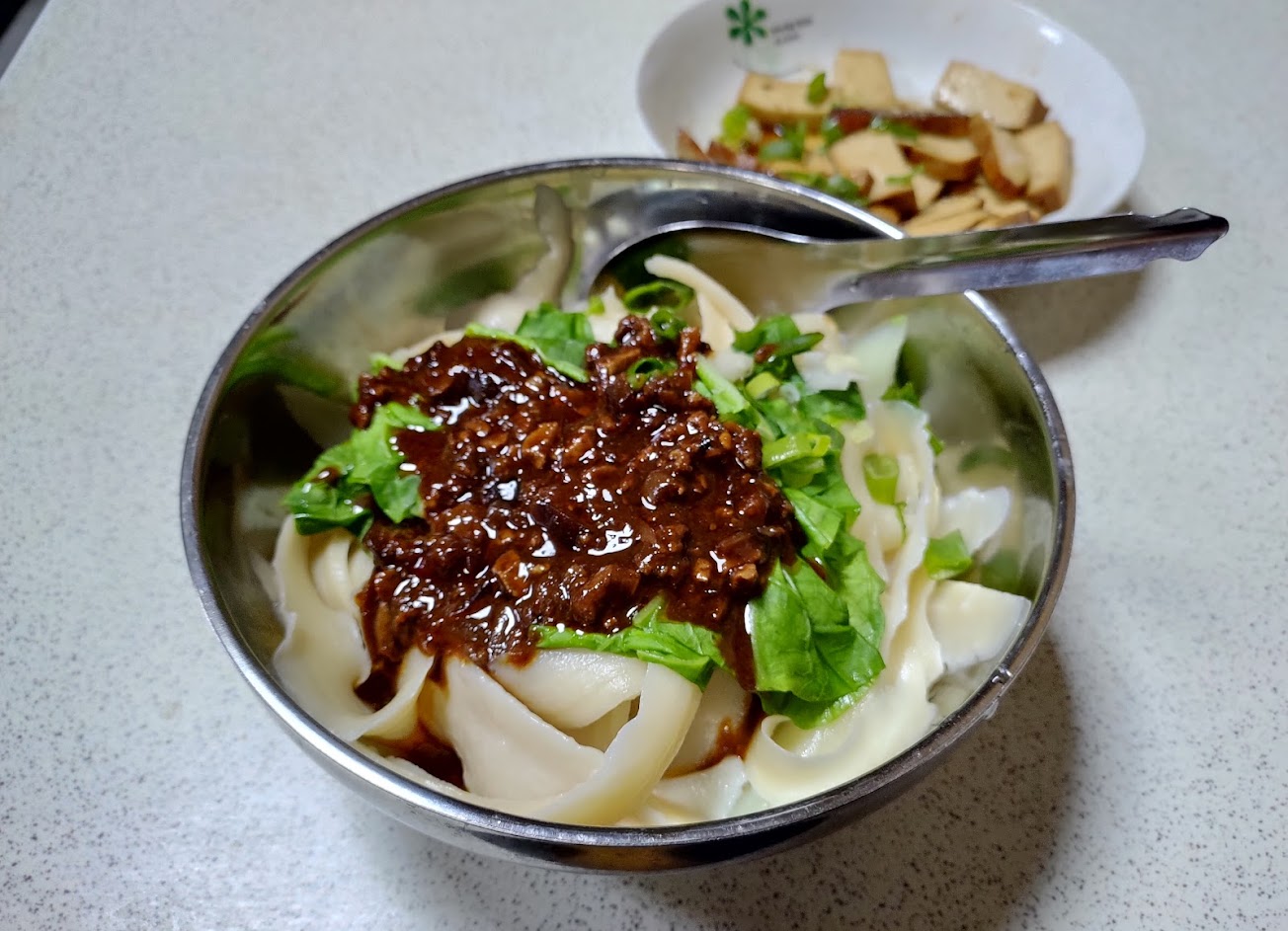晚餐吃刀削牛肉麵,刀削木須炒麵,外加豆干+滷蛋+海帶,刀削麵吃起來有嚼勁,牛肉塊有五、六塊,牛肉湯味道不錯;刀削木須炒麵有紅蘿蔔絲、木耳、洋蔥、肉絲、雞蛋,吃起來稍帶些甜味;豆干好吃,滷蛋有入味,海帶滷到有軟,整體吃起來既有飽足感,而且很用餐環境舒適;店裡結帳目前只能使用現金~?
