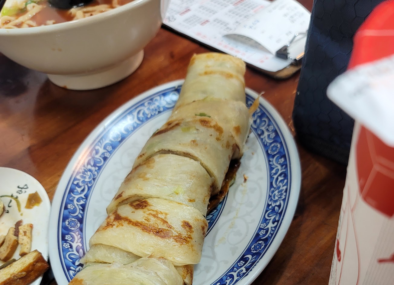 湯頭濃郁,紅燒湯頭微辣,麵條Q彈好吃。 牛肉捲餅,清爽好吃。