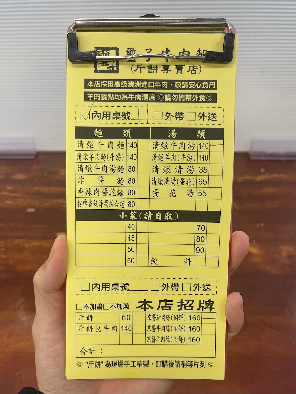 吃過才知道為何生意興隆,人潮洶湧。內用11:30到時已經要排隊進場,建議如果要內用要早點到。內用空間不大,有自製塑膠隔板隔安心。環境尚可,冬天無空調,有提供發票。 牛肉捲餅好吃,餅本身有鹹味,加上辣椒更有層次。牛肉內含甜麵醬,鹹甜度很剛好,推薦點來一試。缺點是價格略高,跟台北的價格有得比。 炸醬麵有小黃瓜,醬。麵條Q彈,鹹度,香氣都很足夠,也能吃到清爽的小黃瓜,搭配非常好。 清燉牛肉湯也很推,沒有清燉的怪味,湯的味道是薑絲、蔥香味,牛肉塊挺多,也燉的很軟,好入口。 這三道吃起來都沒雷,辣椒也很好吃,有香氣非純辣椒,帶有花椒香,敢吃辣很建議加辣。整體會想再去吃,缺點就是價格偏高,較為可惜。 服務 內用 餐點類型 午餐