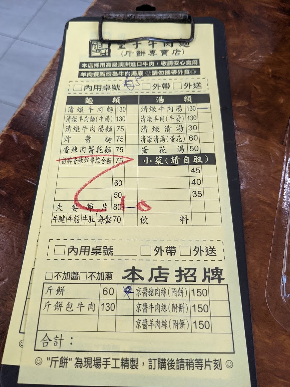 點了清燉牛肉麵 牛肉捲餅 炸醬乾麵 內用結帳本來要跟外帶的客人一起排隊先結帳 後來服務人員看到外帶結帳有好幾個人就說要幫忙結帳 問了要不要小菜 加點了涼拌豬肝 總消費金額405元 等了一下小菜先上 但居然是塑膠袋包著加小菜盤直接放桌上 我們看了真的傻眼 一般小菜不是放盤子嗎?或是放塑膠盒 這種狀況還真是第一次碰到 好不好吃每人感受不同 但基本服務業的精神可能要再加強