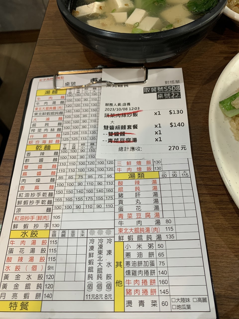 但是2023/08再過去 雖然最近通膨比較大 但是這價位漲幅是不是超前部署 麵類都漲20塊以上 小菜一份60 水餃一顆9元 可以看看之前照片菜單價差有多大