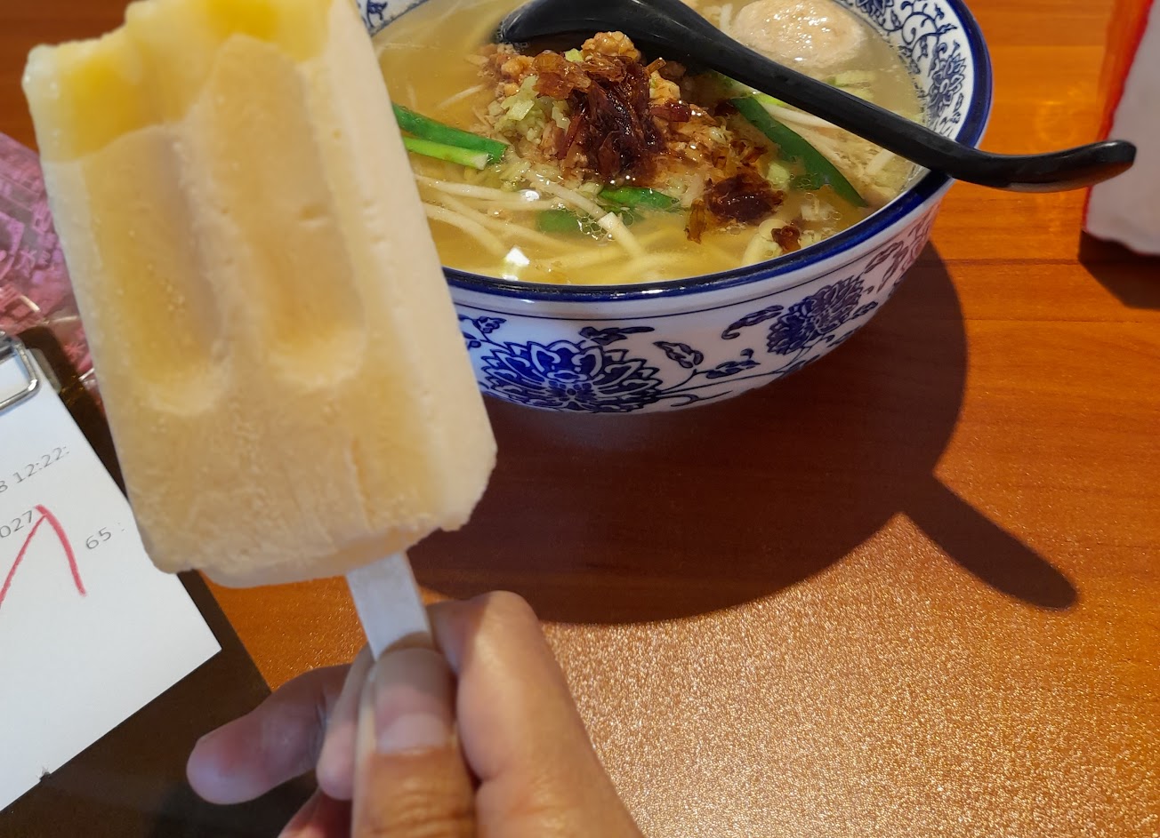 店家很有心,冷氣維修中,貼心送上冰棒退熱(重點是還可以選口味)服務ㄧ流,古早味肉躁湯麵,麵條口感很好,貢丸好吃,湯頭超級好喝,很大碗,開心飽足的ㄧ餐。