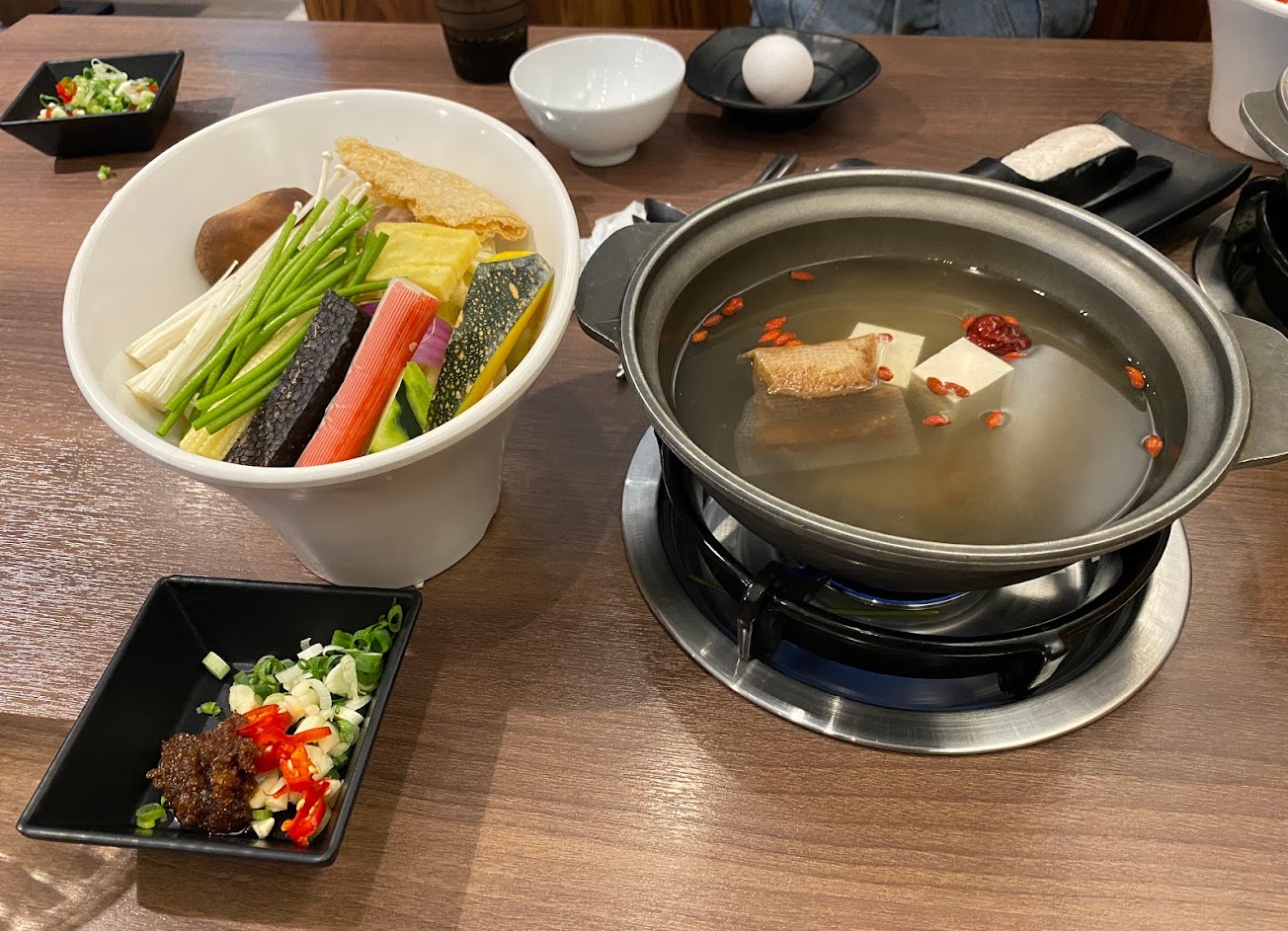 疫情期間外帶,良好的服務態度及美味餐點,我們點了花枝漿、玉米筍、鴨血都很好吃,蔬菜也甜,喝豬肉大骨湯頭熬成的湯底,加上小辣的辣度很剛好。