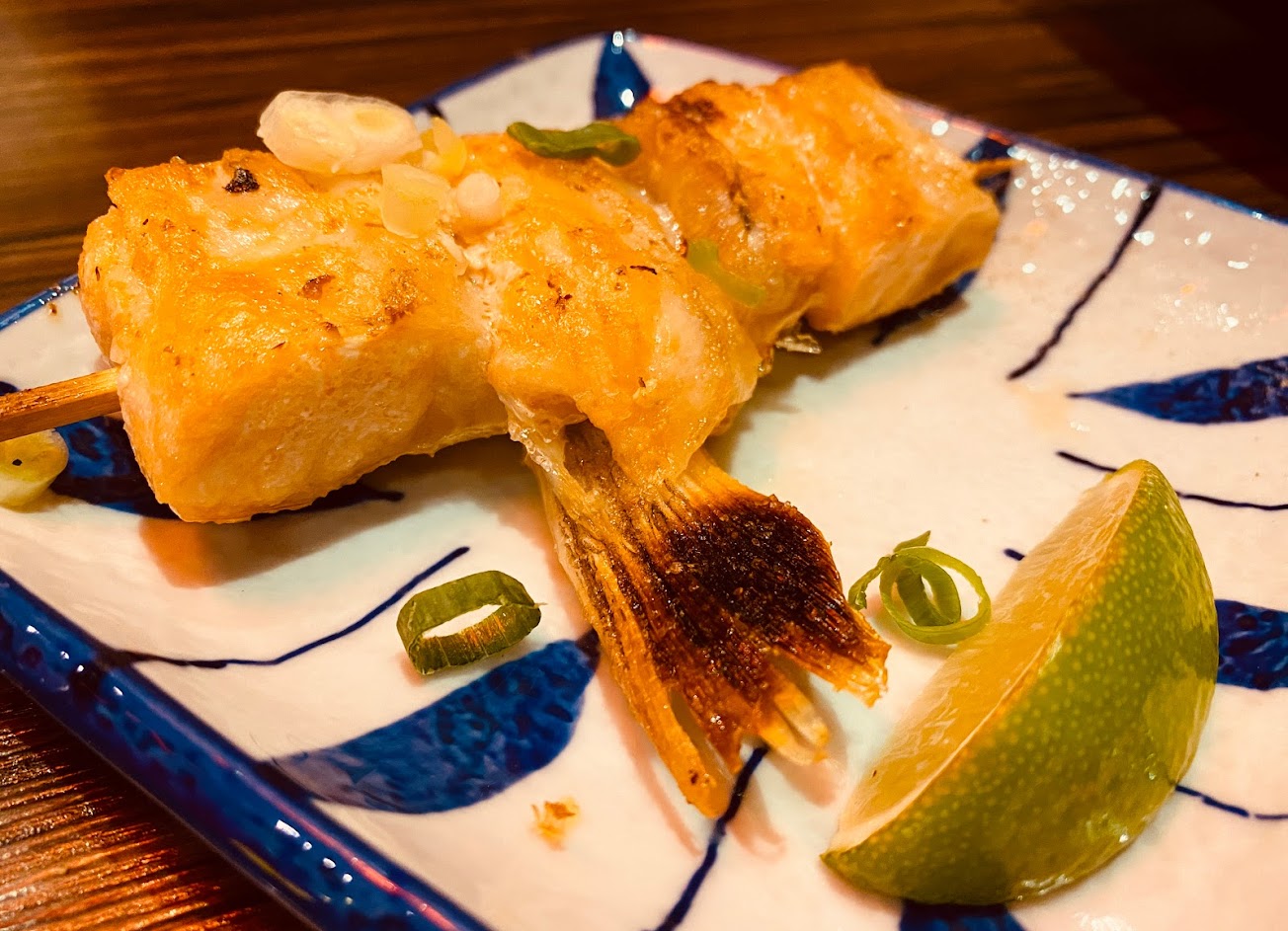 鹽烤鮭魚肚,看起來肥美,使用的部位偏鮭魚肚的位置,;吃起來較油膩,喜歡鮭魚肚的人,應該是喜歡的。可惜我覺得吃起來有有魚腥味。