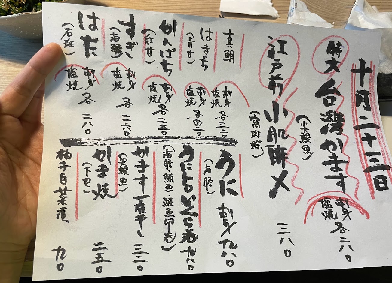 生魚片或是烤魚都非常的好吃。炸蝦也很特別,很像可以生吃的蝦子,裹上一點點粉去炸 一坐下回拿到一張日文的當日推薦菜色(但有小字寫中文)
