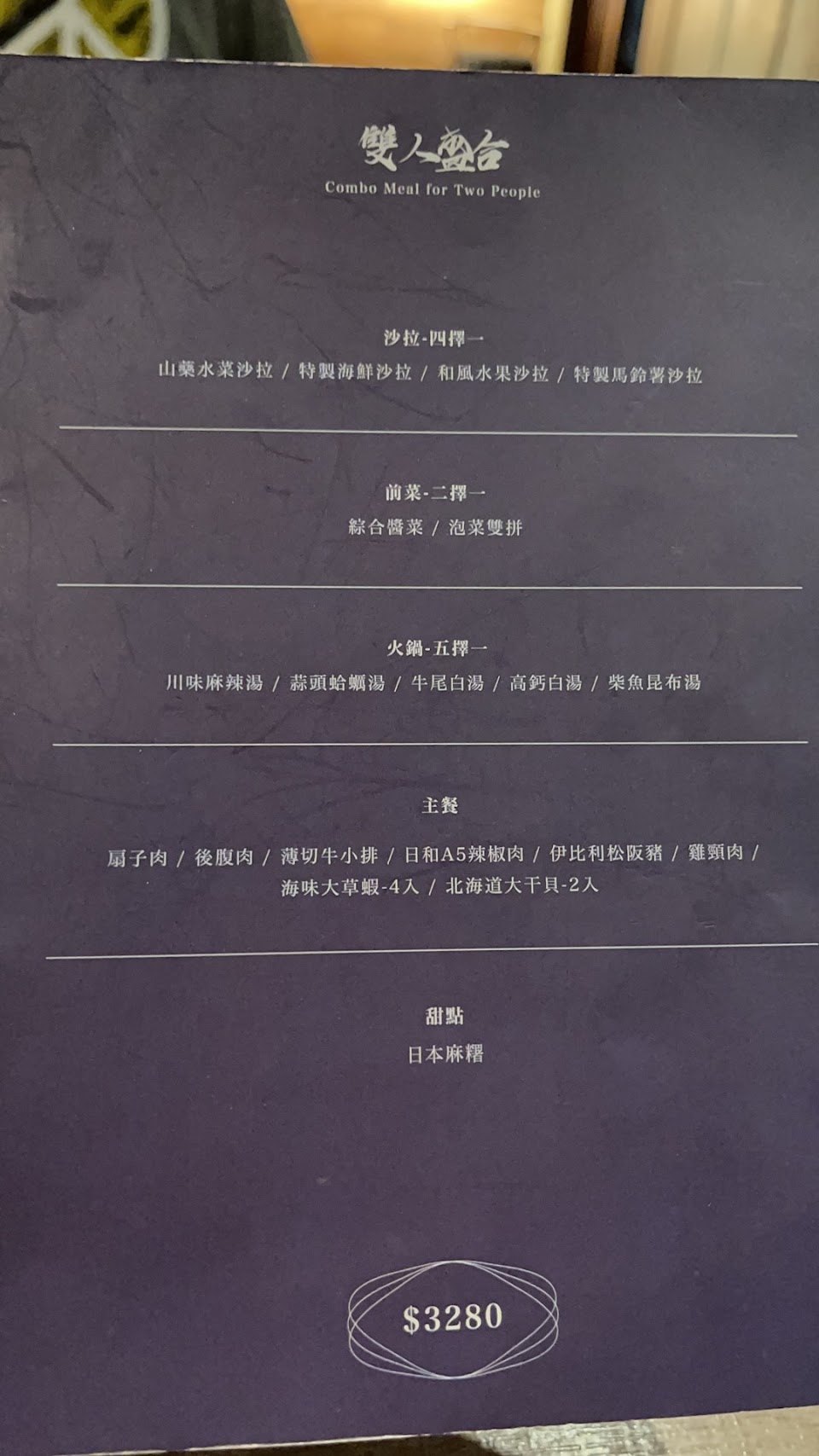 第一次跟朋友來,點了雙人套餐,以及加點了干貝炒飯、蔥燒橫隔膜、牛舌,其實很飽,我們還是兩個男生吃,東西真的好吃,尤其炒飯必點,鍋物的湯頭也很鮮甜,甜點是很綿密的冰淇淋,整體來說對的起這價位,蠻適合帶女生來此約會唷