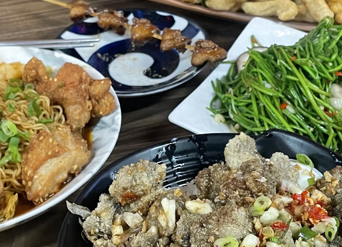▫️避風塘鮮蚵蓋飯 鮮蚵很新鮮也很大顆!配有台式泡菜、溫泉蛋以及柴魚片,白飯淋有甜甜的醬汁,全部的配菜裡柴魚片是點睛之筆增加一層風味的深度,本來不太喜歡柴魚片沒想到竟然是覺得最不可獲缺的?溫泉蛋搭配白飯及醬汁很順口,不知道要點什麼的人推薦嘗試這道! ▫️麻辣日式唐揚雞公仔麵 唐揚雞外酥裡面很juicy,麻辣是真的有辣整體餐點屬於重口味~ ▫️烤物:烤雞屁股、炸物:甜不辣、雞蛋豆腐 烤物烤得很均勻鮮度適中很好吃,炸物甜不辣以及雞蛋豆腐外酥內嫩,尤其要搭配洋蔥很讚! ▫️辣炒水蓮(勁辣) 這個水蓮認真辣,喜歡吃辣的一定會愛,不吃辣的人也可以點不加辣的~這道美味程度我大概可以吃個3盤都沒問題!