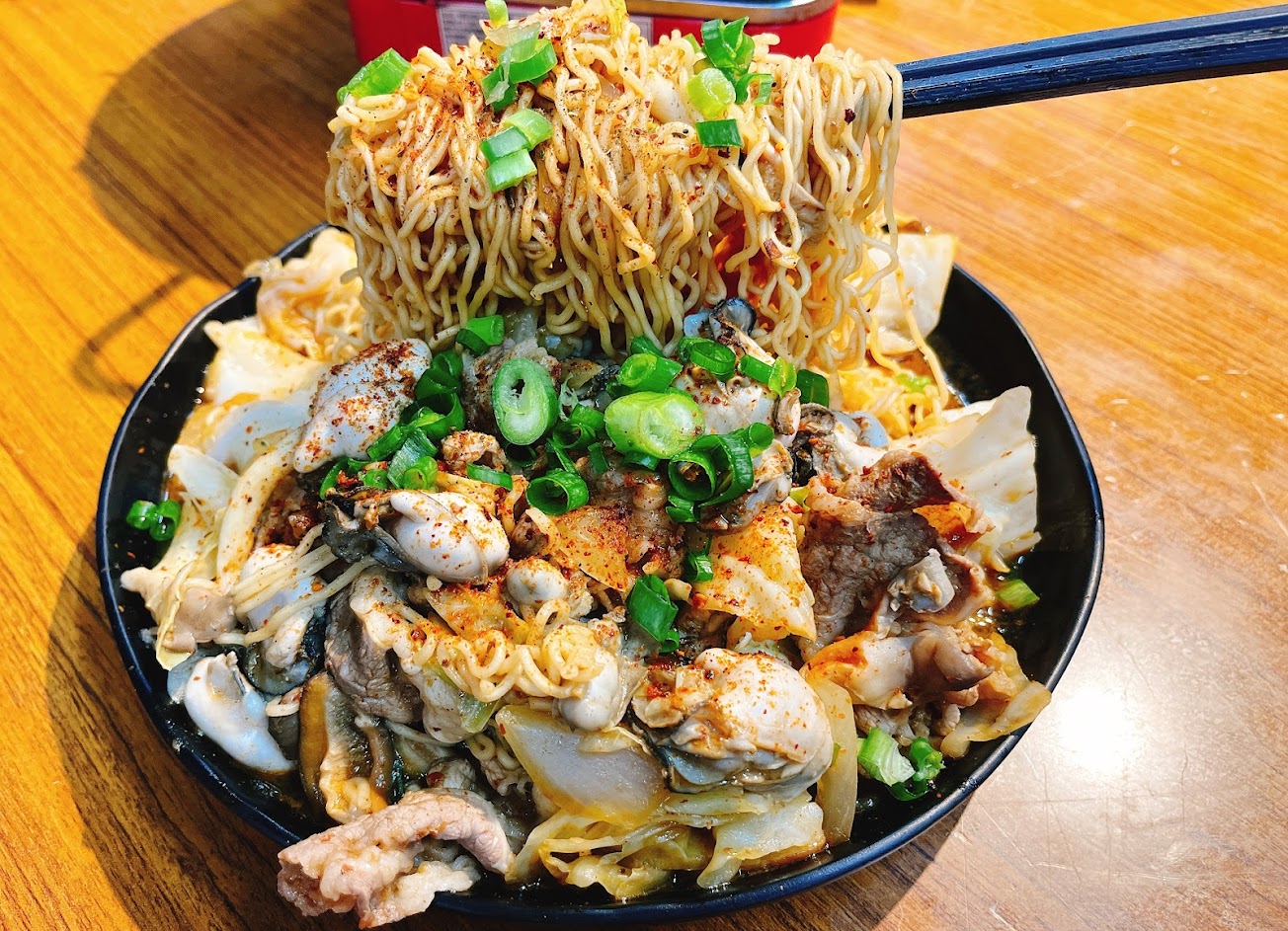 ✨麻辣海陸飛天麵 $299 (2-3人份) 很浮誇的擺飾!!!一上桌真的非常吸睛,還有路人特別來拍照? 公仔麵煮的軟硬度剛剛好,帶有Q彈口感,麵條包覆著滿滿的醬汁及川辣香氣,搭配青蔥的脆,真的讓人一口接一口停不下來? 蚵仔飽滿多汁,牛肉肥瘦比例剛好,配料有香菇、秀珍菇、洋蔥、高麗菜、蔥花,整碗吃得很過癮!