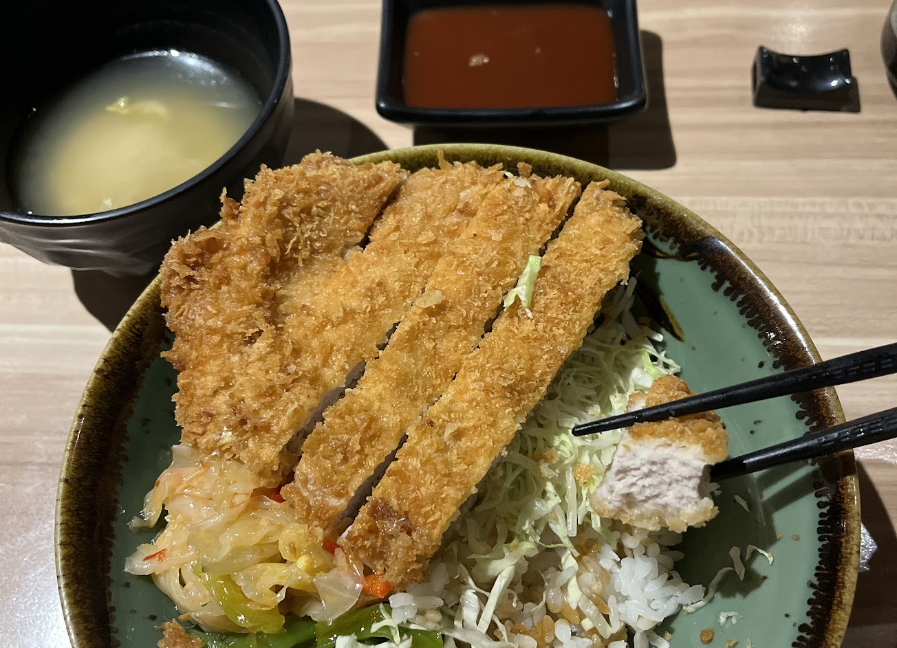 吧台區的間接光柔和的打在師傅俐落手藝上,不時傳來的談笑聲與喇叭圍繞在店中,豬丼的豬排口感厚實、薄薄的麵衣酥脆無比!食畢來碗自助的海帶芽豆腐味增湯,CP值高,推推。