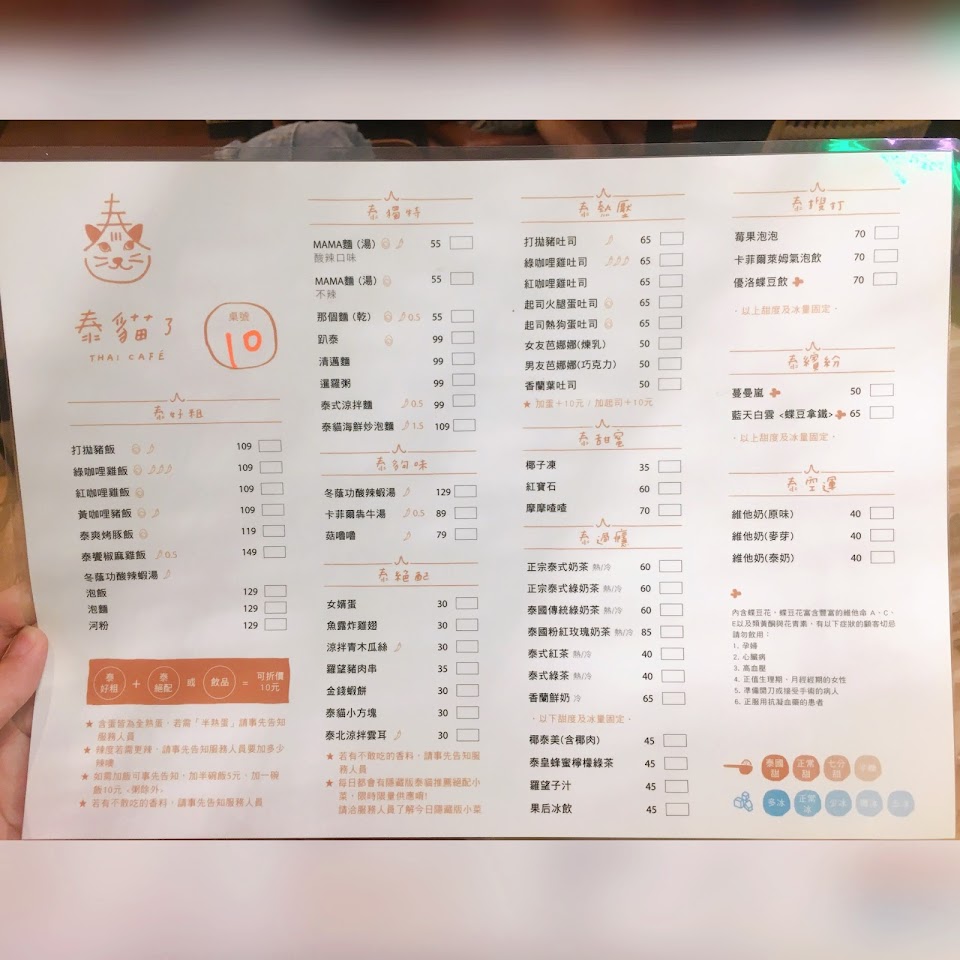 綠咖哩雞飯 泰貓炒泡麵 泰式炸豆腐 金錢蝦餅 泰餐椒麻雞飯 泰貓了海鮮炒泡麵 泰奶 泰式打拋豬