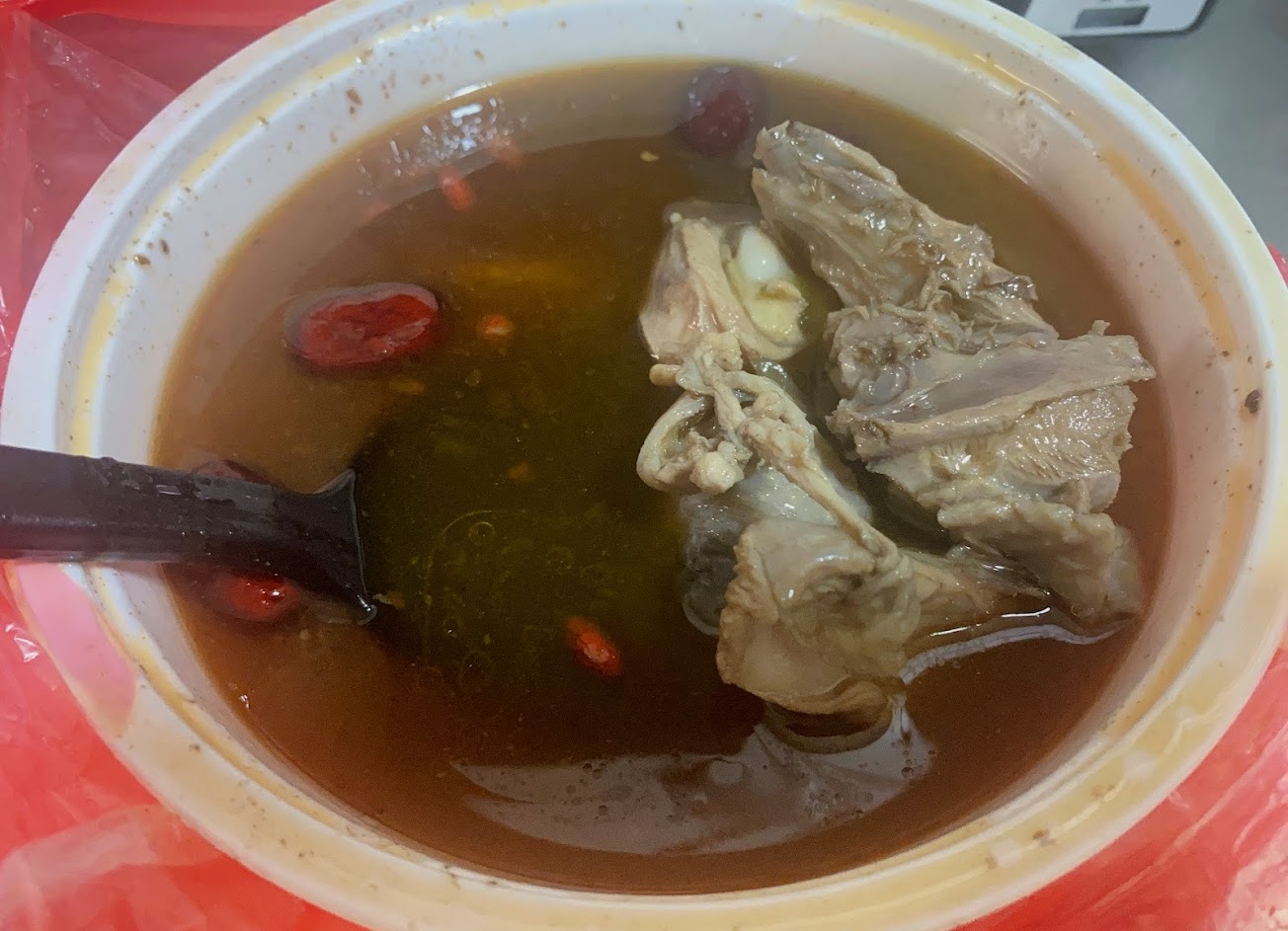 買了一斤油飯(100元)1隻炸雞腿90元、三人份量的雞酒(300元)