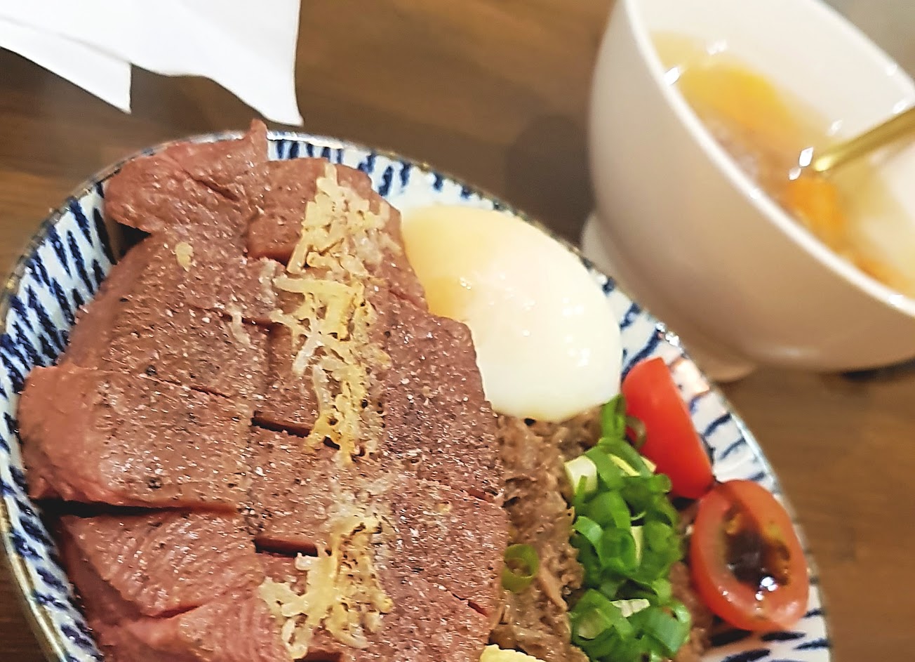 點了牛排丼飯再加點半筋半肉牛肉湯只要再加50元,非常划算。