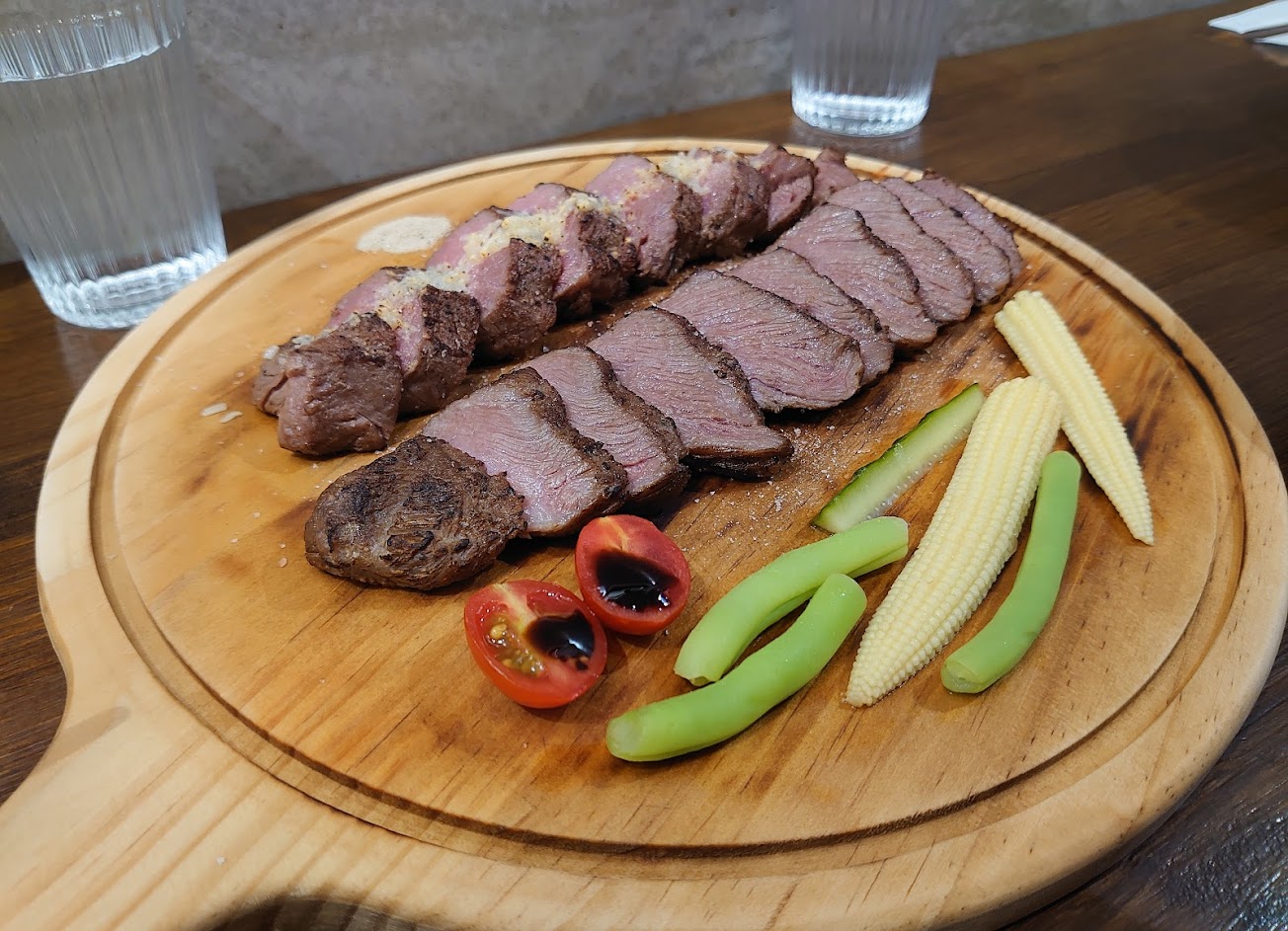 嫩炙燒煙燻牛排恰如其分,口感軟嫩如同菲力,煙燻味道層次豐富,以該價位在新竹絕對找不到第二間能匹敵的高CP值牛排餐館;半筋半肉牛肉燉湯非常棒,味道媲美台南文章牛肉湯,但採用較貴的牛腩肉,軟嫩且牛味十足;提拉米蘇口感綿密咖啡味香醇,連不嗜甜者都愛不釋口。老闆本人外表硬派但有一顆好客的心,喜好牛排料理想悠閒吃頓飯想帶另一半吃點特別的一定要來嚐嚐!惟地方較小座位不多週末假日用餐時段可能得等候,另外東門市場有兩個1143室注意別跑錯棚了(不是謝牡丹對面)XDD