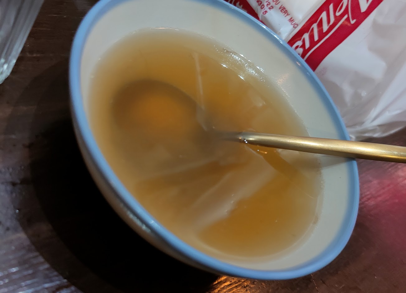 外帶沒主動告知附的清湯是牛肉熬煮的,不吃牛的人要注意一下,個人是因為口味不吃牛,但因為宗教因素的可能就會不小心破戒