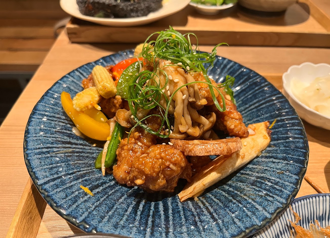 大腿推唐揚雞塊丼飯!黑色外皮的炸雞塊看起來很酷,吃起來多汁又好吃!配菜也很豐盛