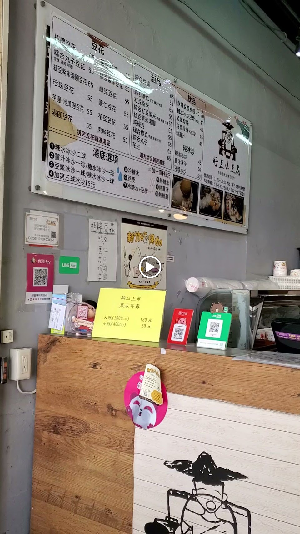 豆花上有像球冰淇淋的糖水冰球跟豆漿冰球,很新奇。味道很不錯,50元有豆花還有花生芋圓粉圓配料,很不錯的口感。店內環境也不錯