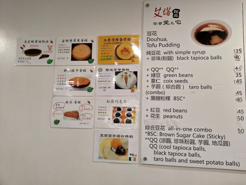艾塔甜品位於府後街,鄰近新竹市東門圓環。主要販售的餐點是豆花、刨冰(夏天)及熱甜湯(冬天),另外還有切片蛋糕可以選擇。可以使用台灣PAY付款。
