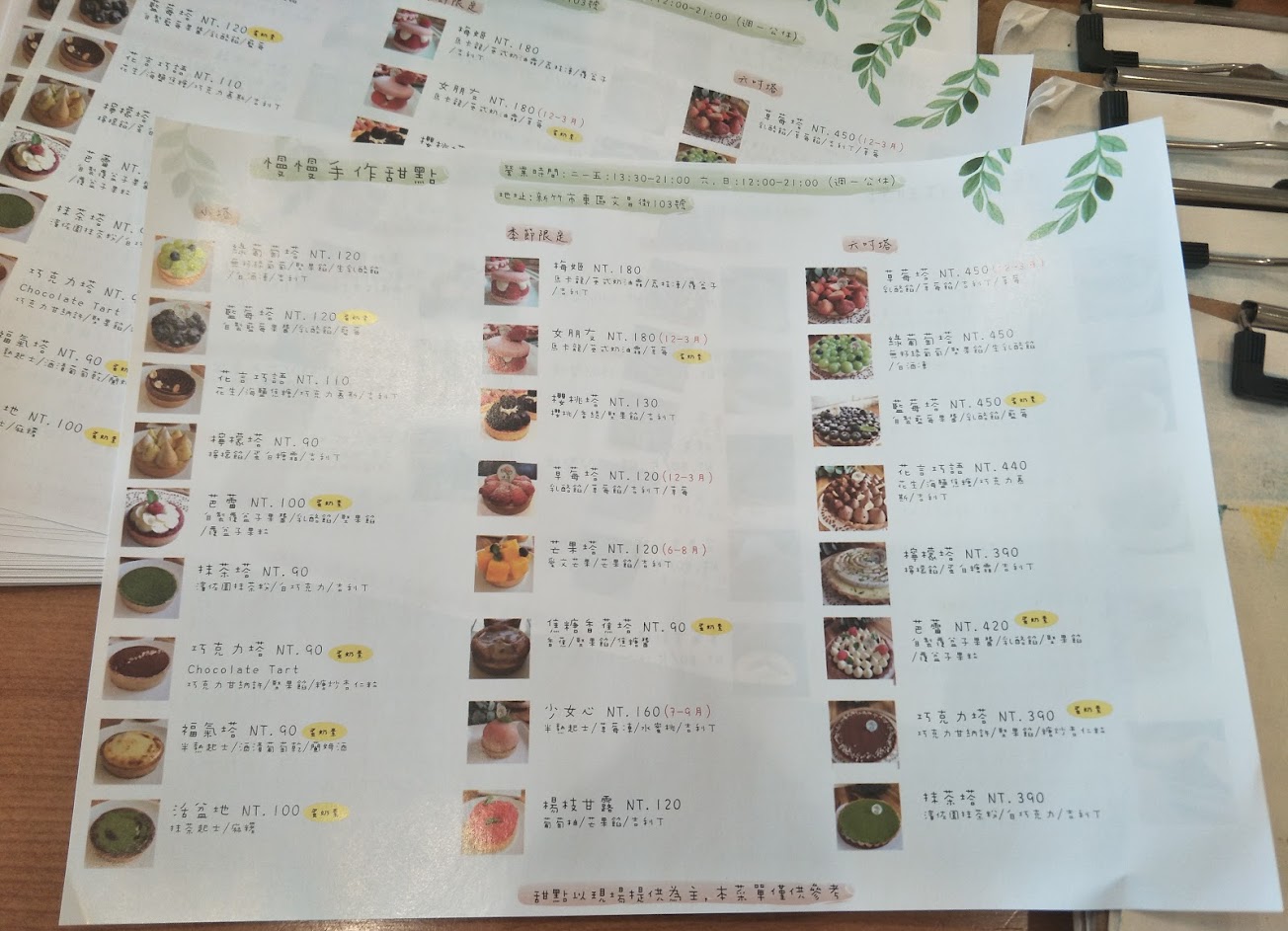 塔類價格在90-130,磅蛋糕有整條販售,亦有單片價格約45。