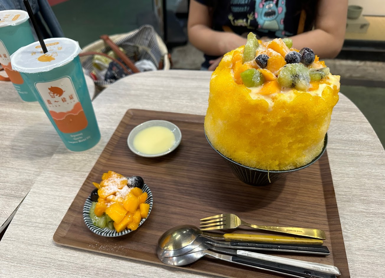 冰店雖然沒有內用空調 但是本店的餐點很細心的把所有水果與刨冰堆疊的恰到好處。中間包裹著鮮奶油的甜甜口感使的這次點的芒果冰酸與甜很好的融合。旁邊也擺放水果與煉乳給顧客帶來不同的風味層次。在炎熱的天氣很適合吃一碗!