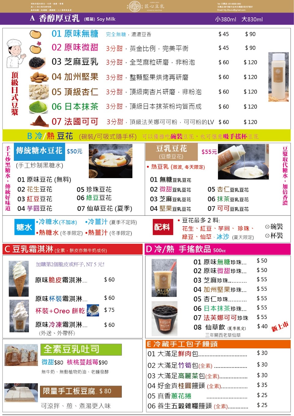 2024最新在地推薦餐廳的菜單_匠心豆乳竹科店-豆花-霜淇淋-手搖杯飲料-珍珠豆乳-仙草手搖杯-豆漿-豆腐-科學園區竹科下午茶-健康飲品專賣店的菜單、圖片