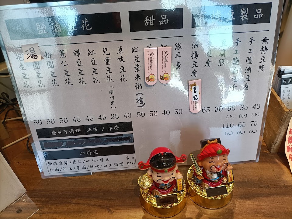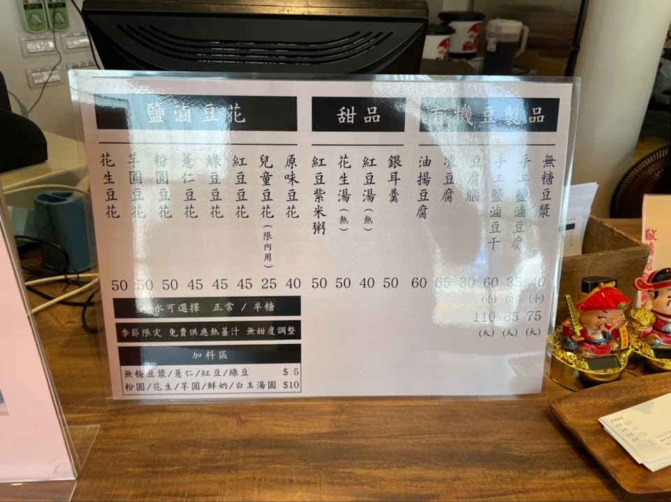 豆花的份量算蠻大的,這樣一份粉圓豆花是55。店內環境算不錯,裝潢蠻有味道的。有賣其他豆類製品,豆花選項有提供份量較少的兒童豆花。如果是吃飽飯來吃點心的話不建議直接點一份,會太多。