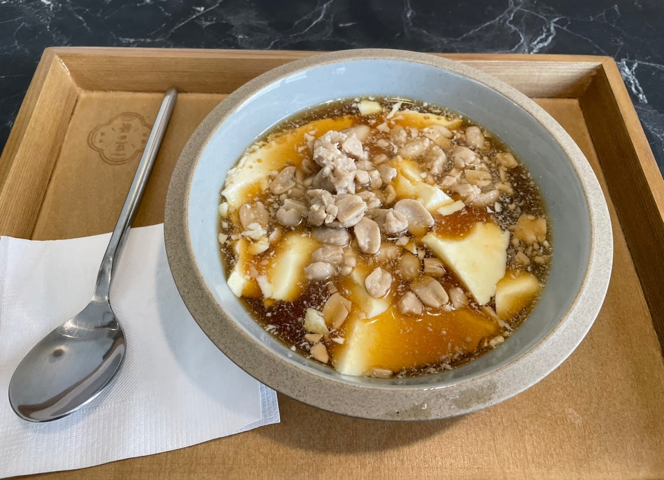 鹽滷豆花,口感偏紮實一點,比起傳統軟綿綿豆花更接近豆腐一點點,但也沒豆腐這麼實。整體蠻好吃,份量偏少。