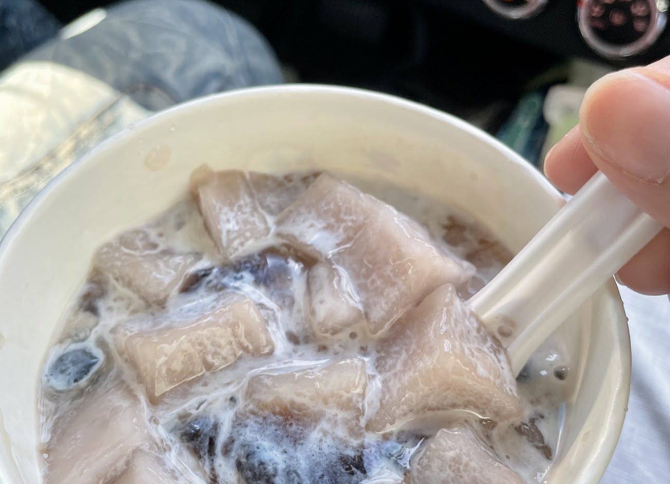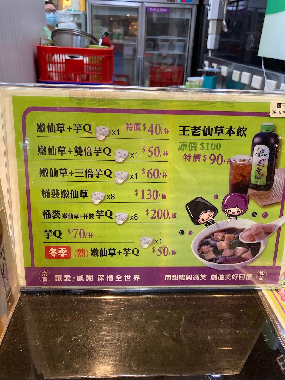 芋角剛出爐時熱熱的放在嫩仙草上,真的超棒的!