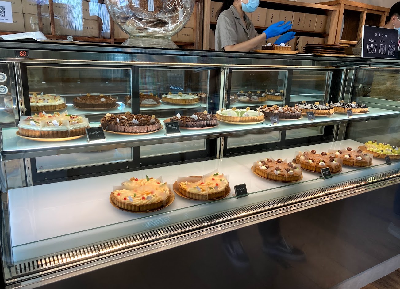 環境和光線營造出一種靜謐又溫暖的感覺,一推開門就見冷藏櫃裡陳列的塔們漂亮精緻又俐落,整體讓人心情愉悅。