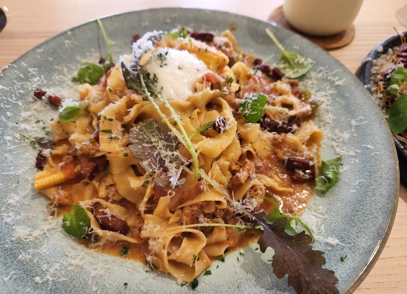 義大利麵不錯!調味適宜,口感獨特。麵條口感和一般義大利麵不同,較趨近於意麵及好勁道泡麵的口感。