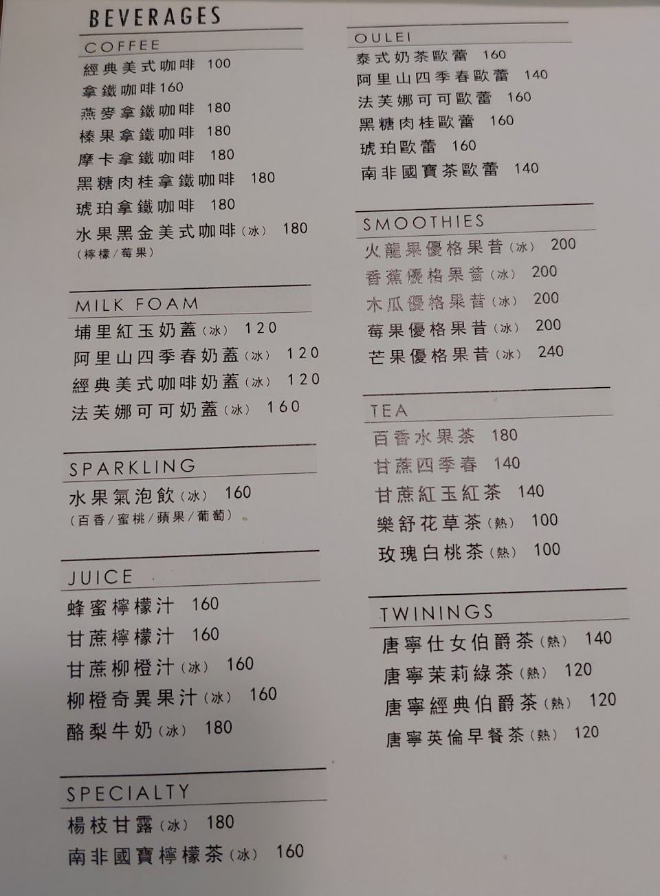餐飲Cp值很低。向店員反應燉飯胡椒味重,老人小孩受不了,店員卻第一時間反駁不可能,雖說要換餐點給我們,最後卻算進帳單費用。飲料味道普通,一杯看來不到500ml,卻要價120-180。
