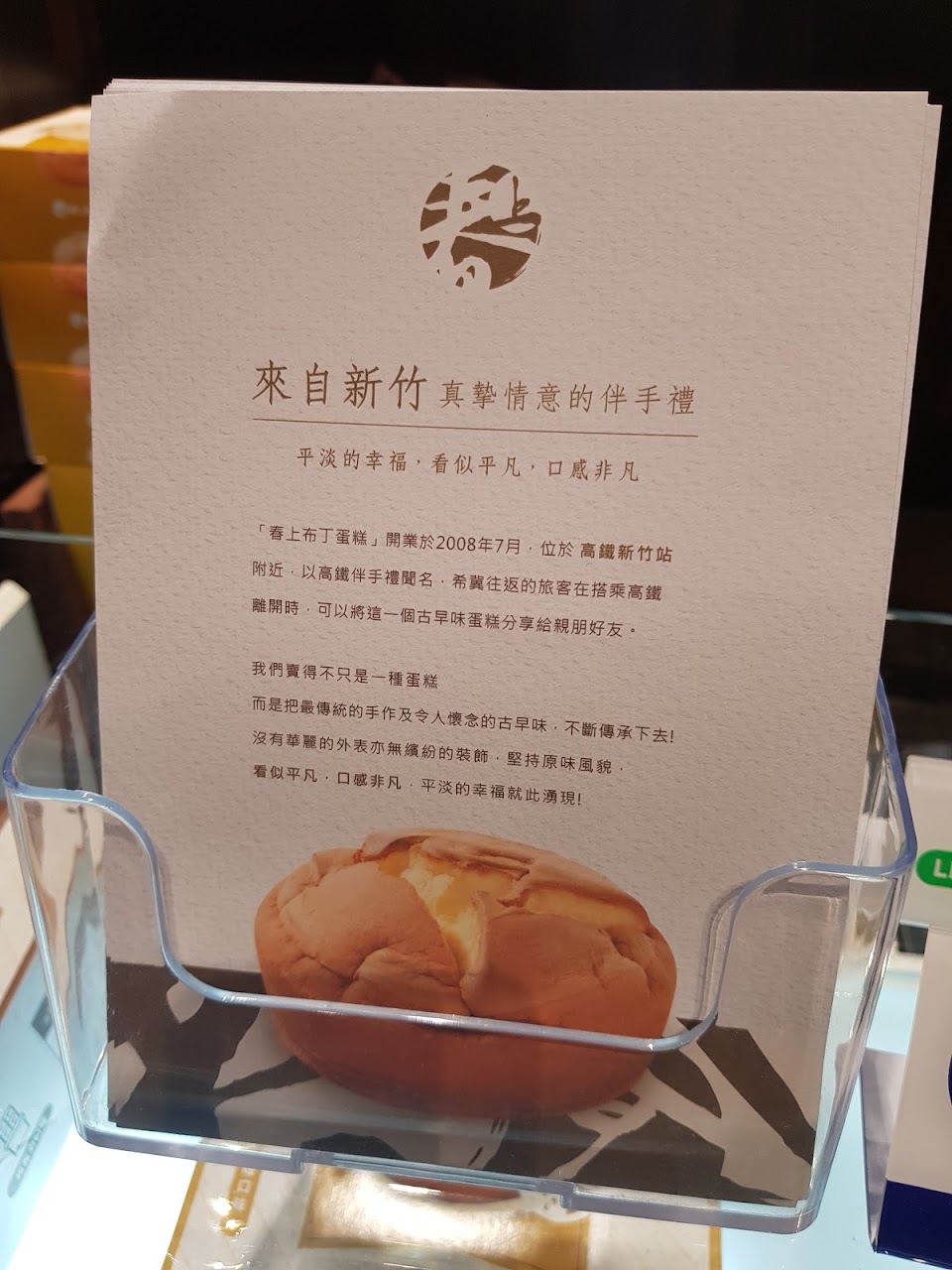 「布丁蛋糕」早期在40、50年代,在喜宴外燴辦桌時,是最後的一道點心,因為它的外型看起來就像布丁,所以稱之為『布丁蛋糕』。隨著時代的改變,此布丁蛋糕消失了一段時間,也漸漸被世人遺忘,為了保留古早傳統懷舊口味的蛋糕,春上經過不斷地研發.精心的研究與改良,做出口感綿密、組織Q軟、風味絕佳的懷舊蛋糕。「春上蛋糕」開業於2008年7月,位於新竹六家高鐵站旁,訴求的是高鐵伴手禮,希望每位旅客搭乘高鐵離開新竹時,都能帶一份好吃的伴手禮送給親朋好友。