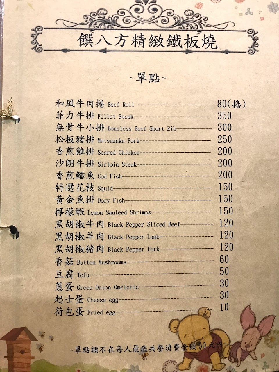 小孩在餐廳用餐打翻了湯品,本想默默擦乾就好,但老闆娘發現後很親切的重換了桌紙,很感謝她。鐵板燒除了青菜以外還有多滷白菜和大蒜麵包還有餐後甜點,這樣同樣的價位,在台北是吃不到的。