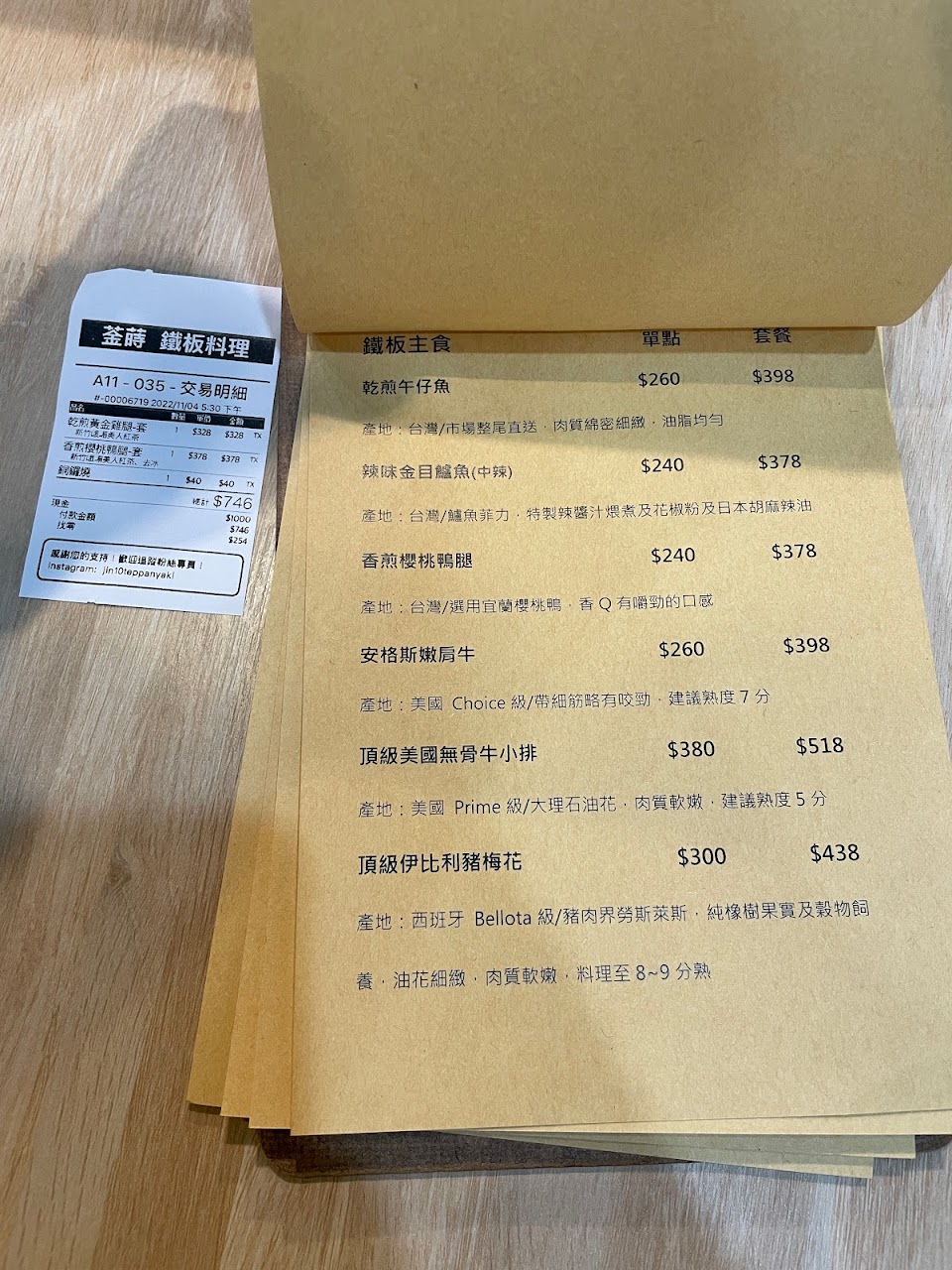 乾煎黃金雞腿(套餐):318 頂級美國無骨牛小排(套餐):498 起司蛋捲:80