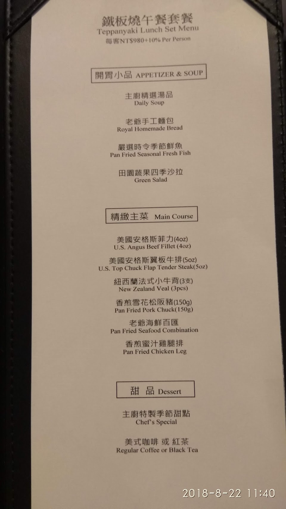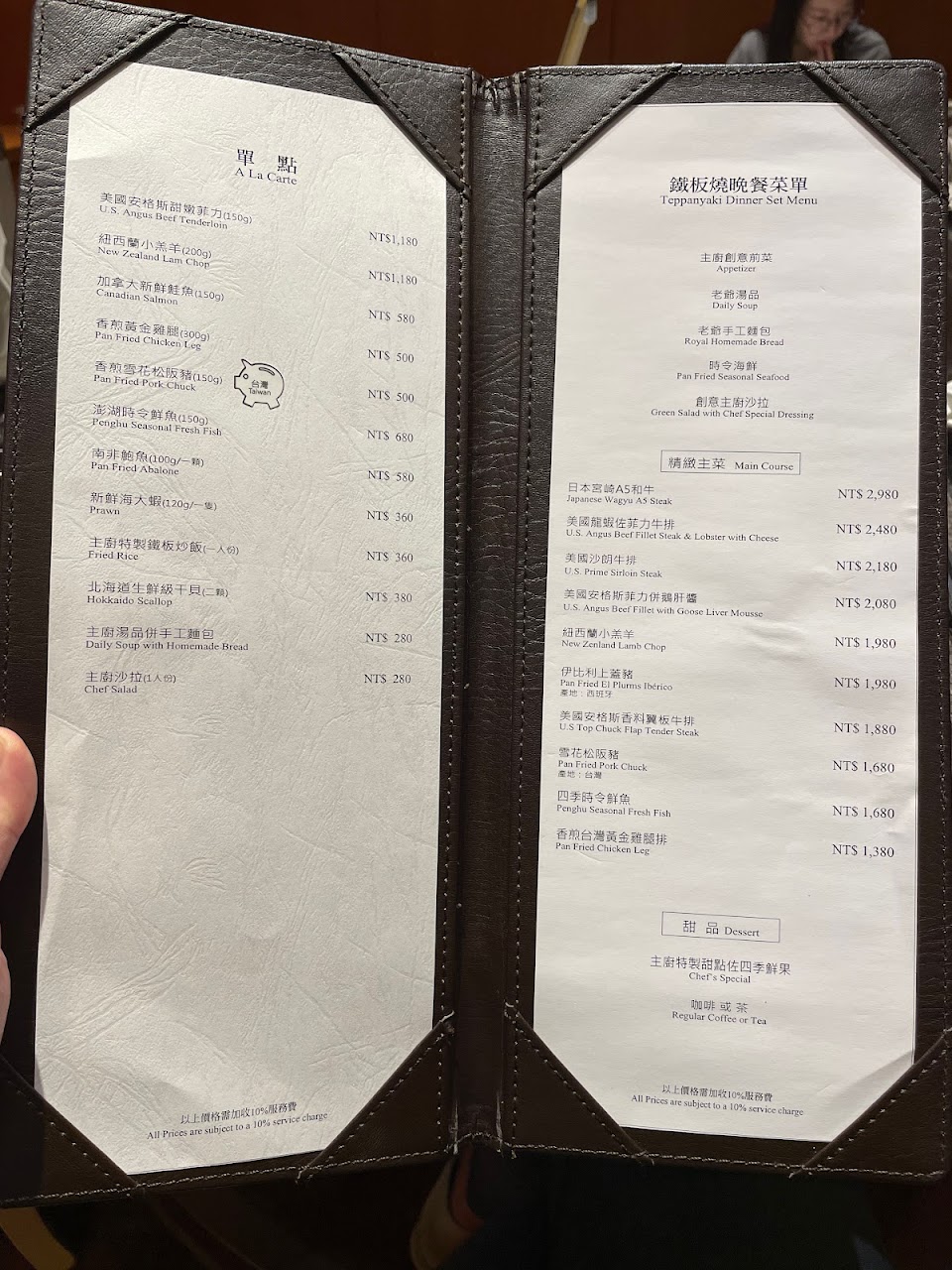 此次經驗感受非常舒服!無論是在食材或服務上都在標準之上,且個人感覺水準在新竹地區絕對是名列前茅,這次分別點了和牛跟石斑魚套餐,前菜的海鮮拼盤更是讓我覺得驚艷,因為基本上進口的海大蝦尺寸巨大之外,其鮮度更是無可比擬!個人覺得雖然套餐內容稍嫌不足?但以正常男生食量是可以吃飽的,師傅煎牛排時會表演噴火秀,為等候餐點時可以增添些許節目,這次來訪套餐以外的單點鮑魚,現場出了點小意外!但是不得不讚美服務人員當下的解釋及服務非常順暢及到位。