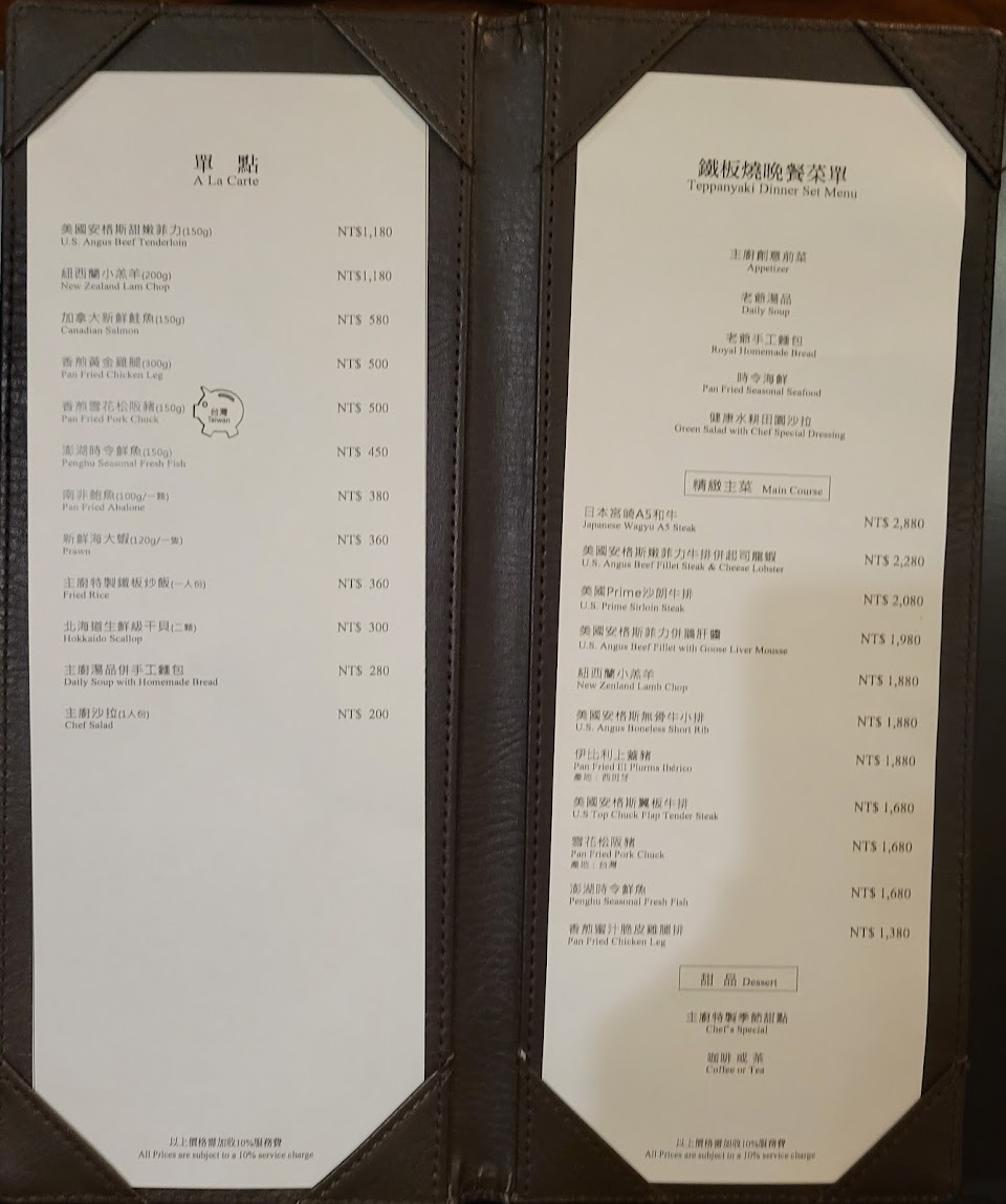 食物品質有些對不起這價位, 開胃菜不錯, 但主菜松板豬硬翹翹、又韌又難嚼, 而且小小一份, 真的是主菜嗎?一旁的炒蒜片也已經軟綿綿的了, 但最後的甜點雙餡燒還蠻好吃的。整體來說CP值不夠好? …
