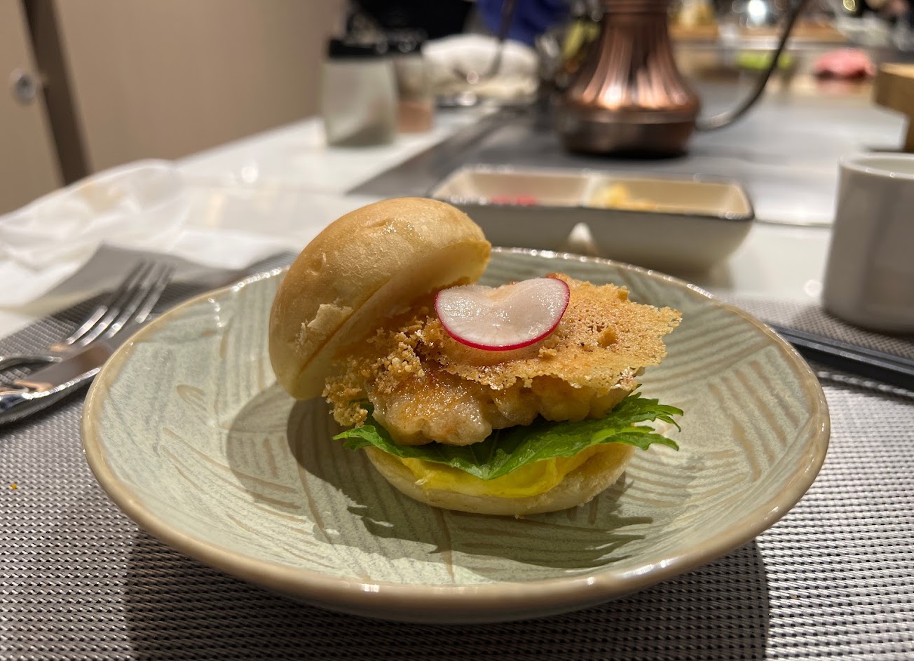 因為不吃牛,和牛漢堡替換為小卷漢堡!內夾紫蘇葉非常清爽、小卷脆口,非常喜歡這道料理!