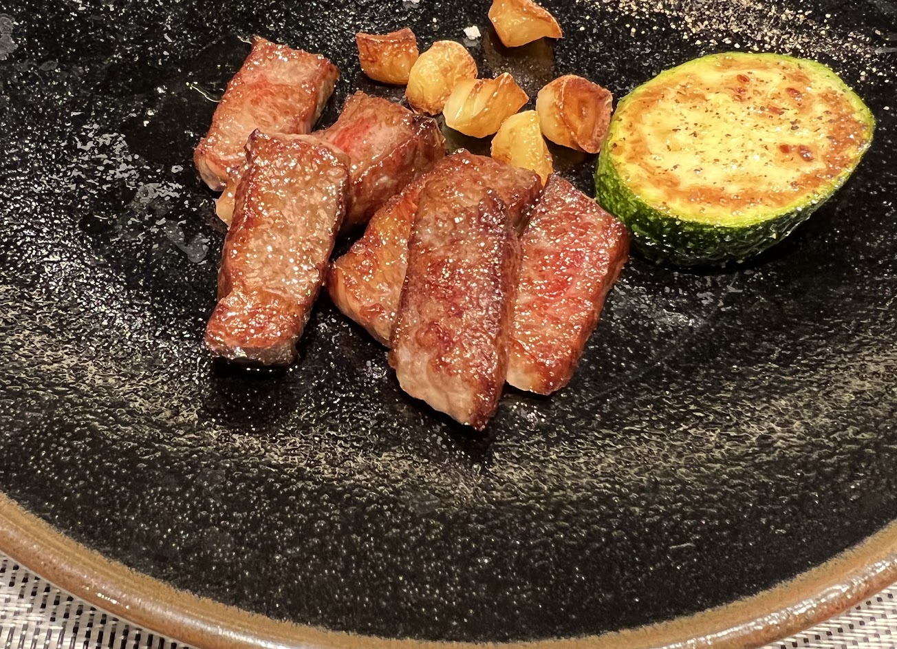 8.A5和牛3分熟:主廚推薦熟度,雖然只有一小塊但超好吃,真正的入口即化,吃起來因為油花多比較肥膩,但還是很軟嫩很美味,不愧是A5和牛喔喔喔喔!有吃一口家人點的A4五分熟的和牛,是稍微有嚼勁比A5瘦一點的肉,一樣很美味,如果不喜歡油花太多蠻推薦點A4的。
