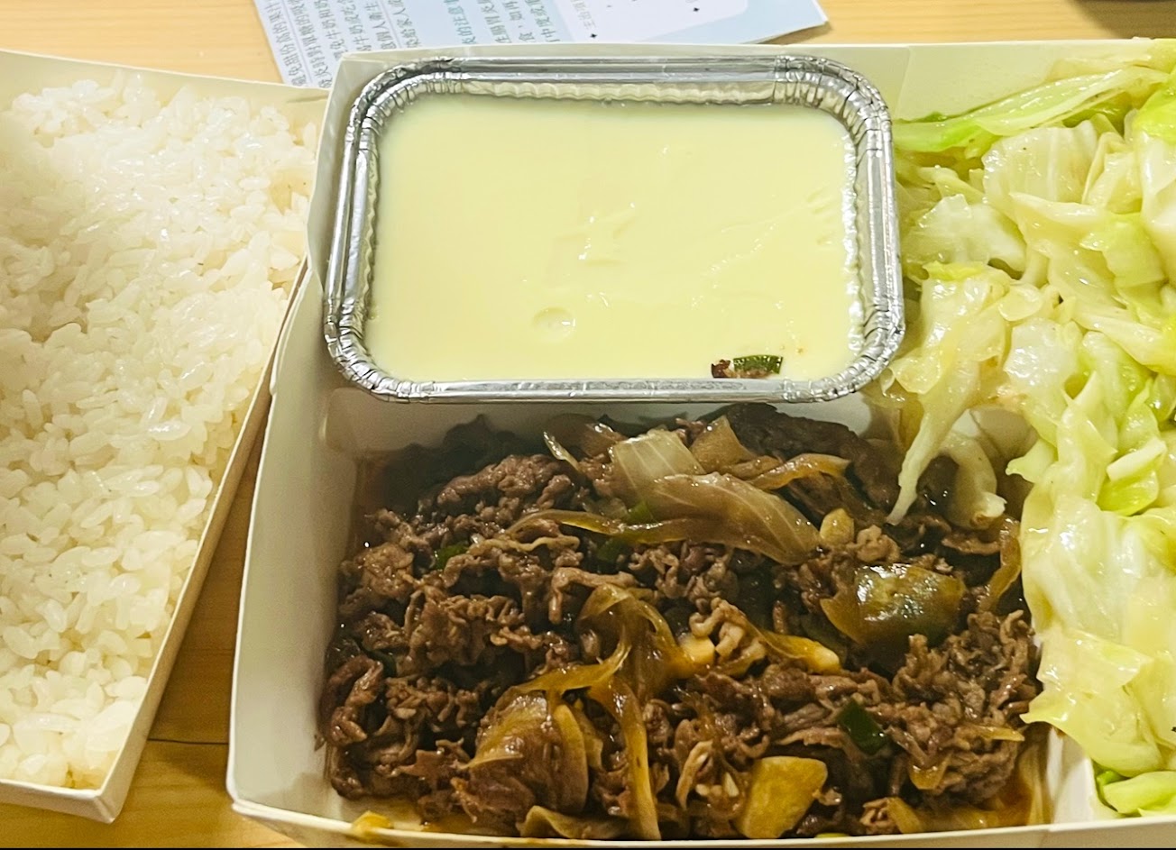 點的是雞肉(很下飯!),有附一盒飯、兩樣青菜(應該是先炒好的,私心覺得高麗菜比較好吃)跟蒸蛋、湯(是不酸不辣的酸辣湯XD,但應該每天的湯都不太一樣,之前看別人評論有拿過竹筍湯);身為食量稍微大一點的女生,吃完算是有飽
