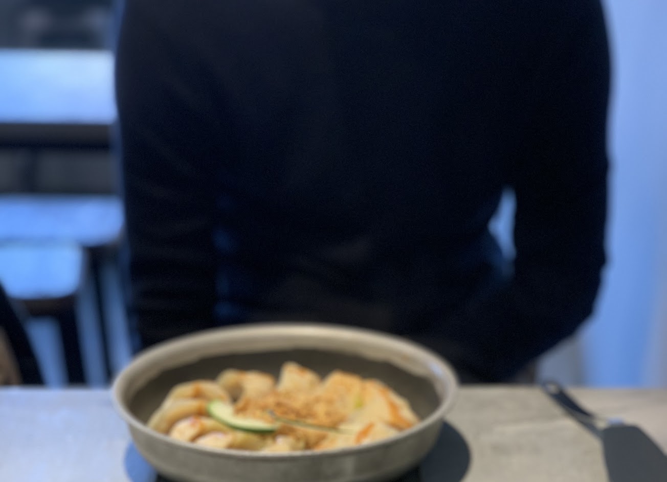 熱騰騰的鐵鍋上餃子,蠻好吃的,會爆漿,只是油了一點點