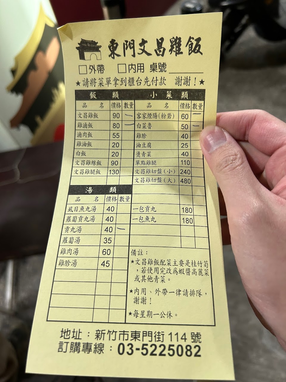 人潮頗多,因位置狹窄店家僅開放外帶,外帶採取點餐排隊廣播叫號取餐,排隊動線清楚一目了然,不會無所適從。 點了文昌雞飯90$、蘿蔔貢丸湯40$、客家煙腸60$。 店面環境整潔,櫃檯阿姨態度佳。 文昌雞飯的筍絲清爽不油膩,蔥油和雞油拌飯很香。 蘿蔔貢丸湯湯頭清甜,蘿蔔很多塊,貢丸脆,價格便宜。 第一次來新竹,看到客家煙腸覺得好奇就點了,口感黏黏糊糊的包裹著豬肉條,本身索然無味,要沾其隨附的辣醬,辣醬口味不錯,煙腸個人不太喜歡。 服務 外帶 餐點類型 晚餐 平均每人消費金額 $1-200