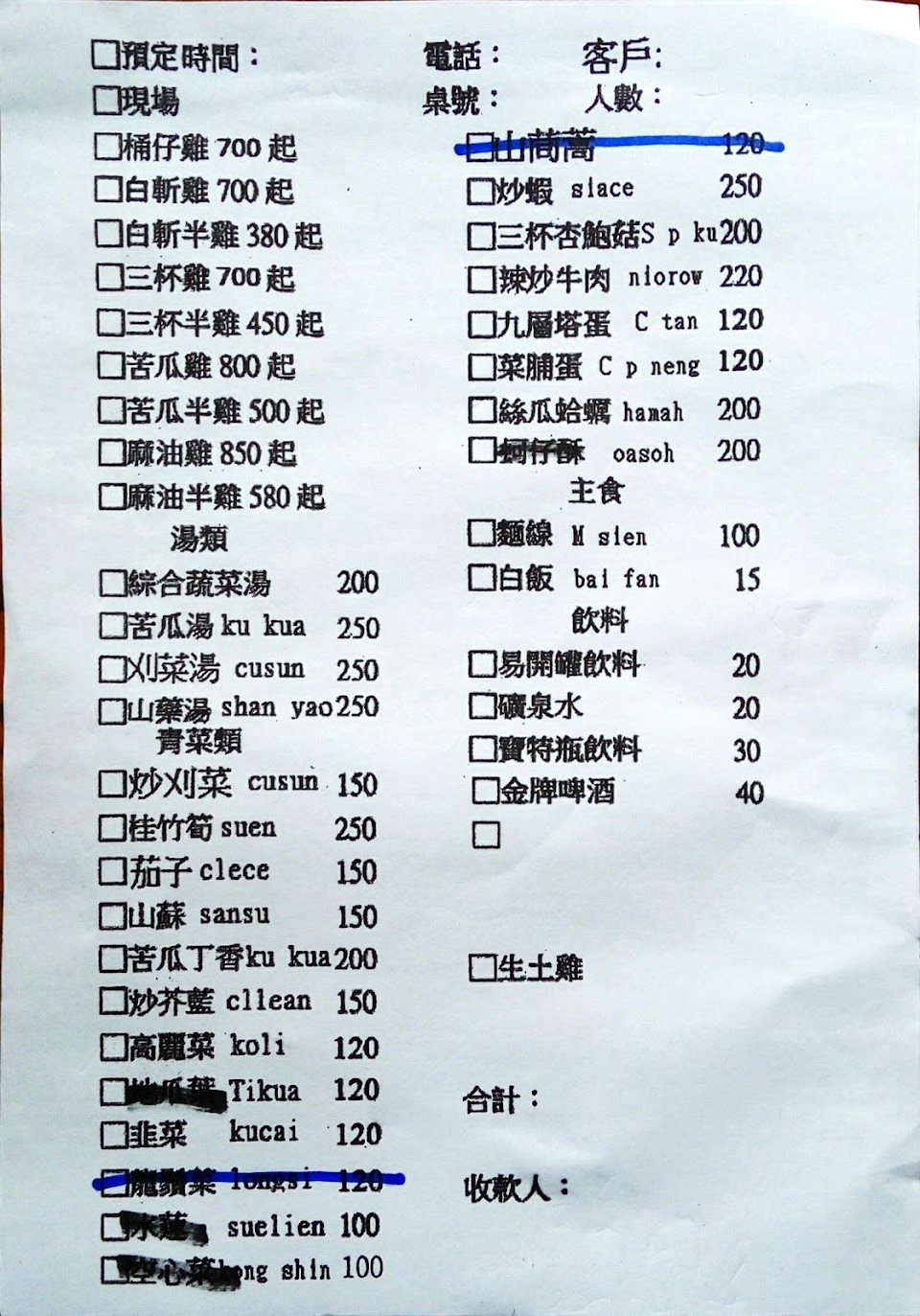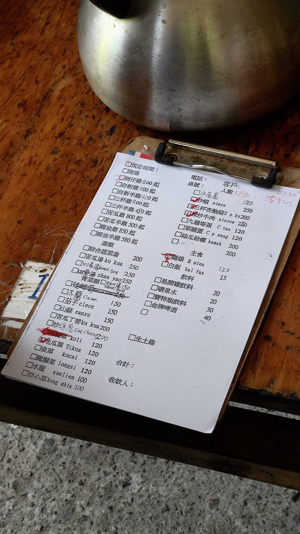 菜單的英文翻譯還蠻有趣的 爬山路過,還蠻幸運剛好前一組客人遲到,所以老闆先把烤好的雞給我們 雞有很重的烤肉味,沾雞汁好吃,但不知道為什麼雞肉有點柴 炒山蘇的份量有點少,山藥湯視覺上也有點少 我覺得有點over priced 不過整體口味還蠻不錯的
