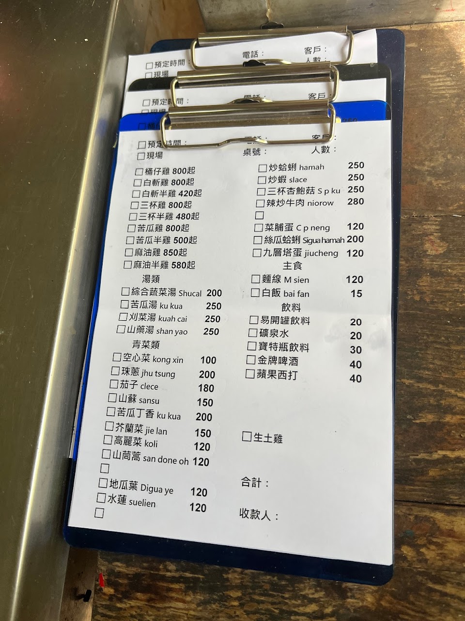 雞肉有桶仔雞、白斬雞、三杯雞、苦瓜雞、麻油雞。 青菜有刈菜、茄子、山蘇、苦瓜、芥藍、高麗菜、地瓜葉、韭菜、龍鬚菜、水蓮、空心菜、山茼蒿。 桶仔雞需要時間較久,建議40分鐘先預訂。