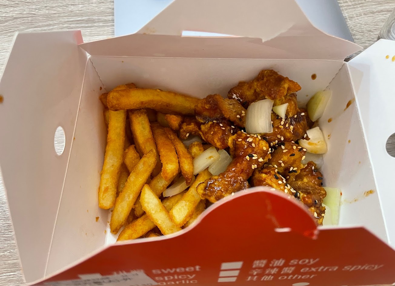 薯條與炸雞好吃,薯條屬於鬆鬆的,炸雞類似糖醋雞肉,比較不像韓式辣醬雞。但整體來說很好吃推薦。