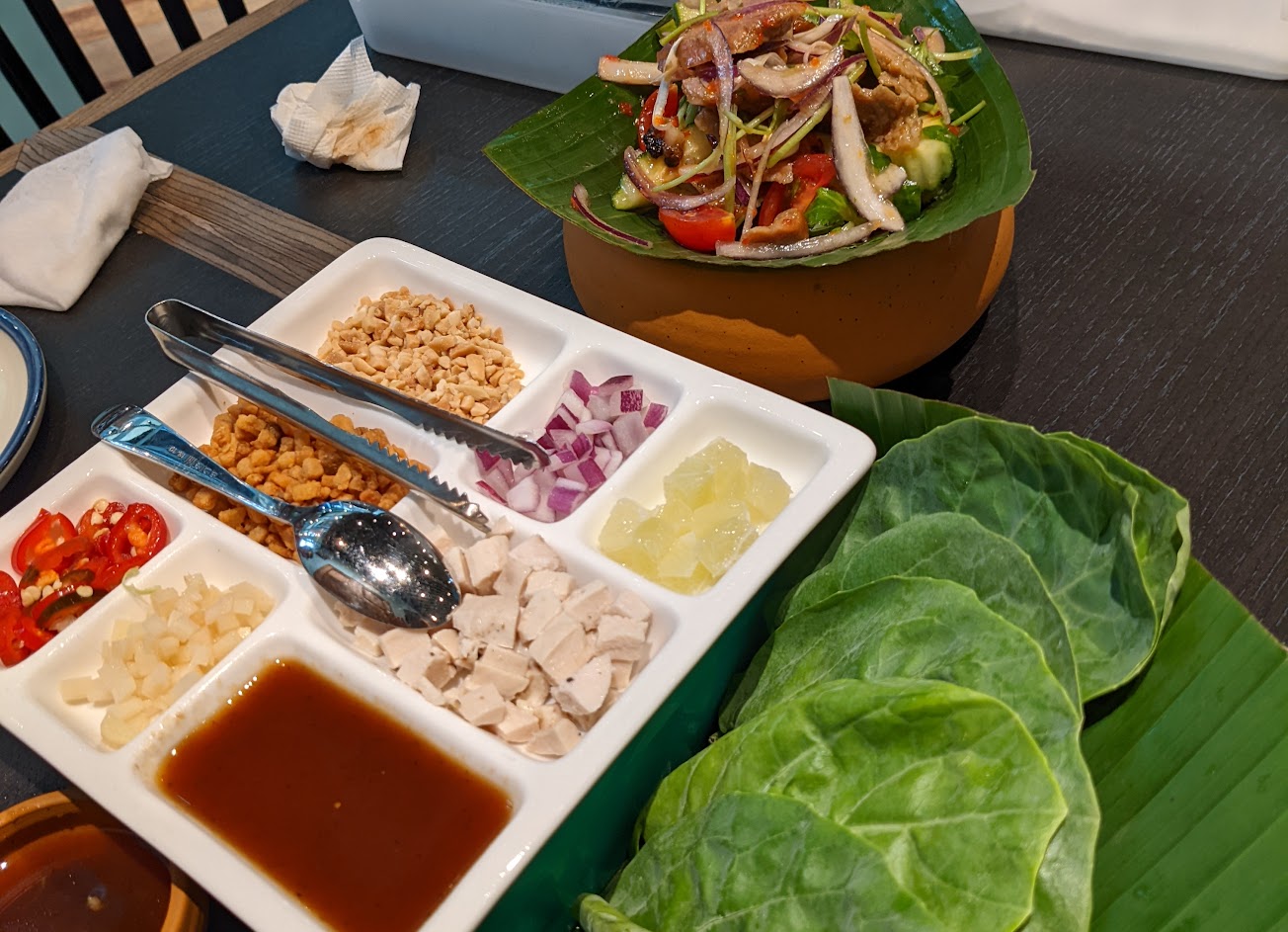 點雙人套餐,便宜一點點,芋頭金磚口感像芋頭版蘿蔔糕,涼拌碳烤豬肉裡有一大片像是紅甜椒的食材,那是超辣的辣椒,第一口吃下去還好,後來辣感蔓延了十分鐘左右,狂吃冰塊都壓不掉超痛苦,不吃辣的人吃的時候要注意一下,除去那個地獄辣椒,其他食物都很特別適合夏天,清爽開胃,榴槤包榴槤味沒有很重,不排斥的人可以試試。